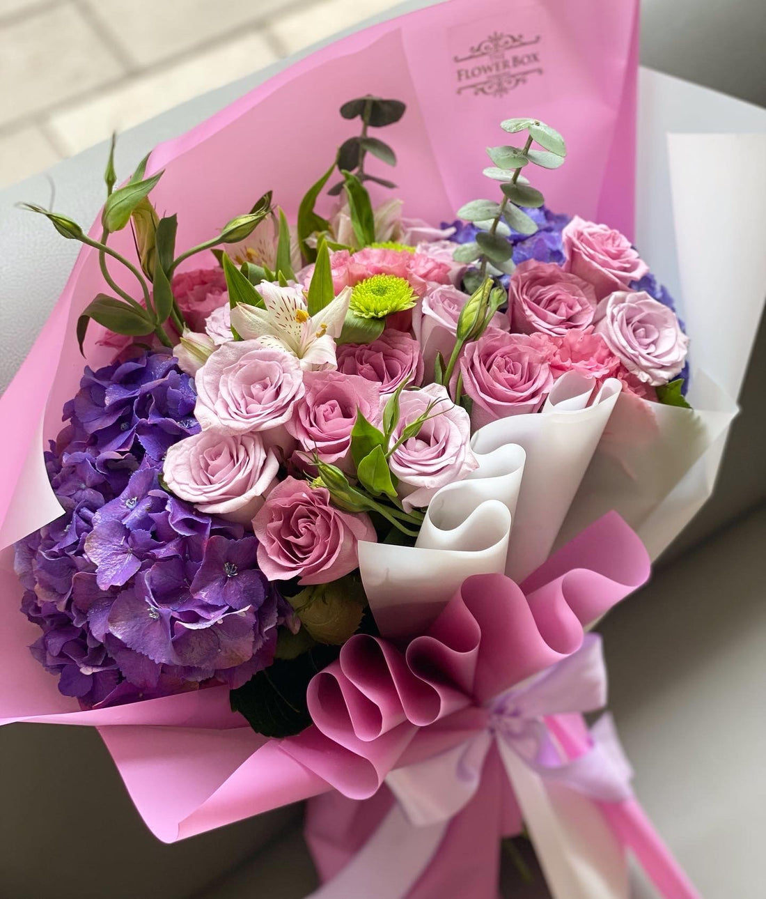 Nuestro bouquet elaborado con el tono rosa y morado perfecto Flores utilizadas: Rosas, claveles, eucalipto,...