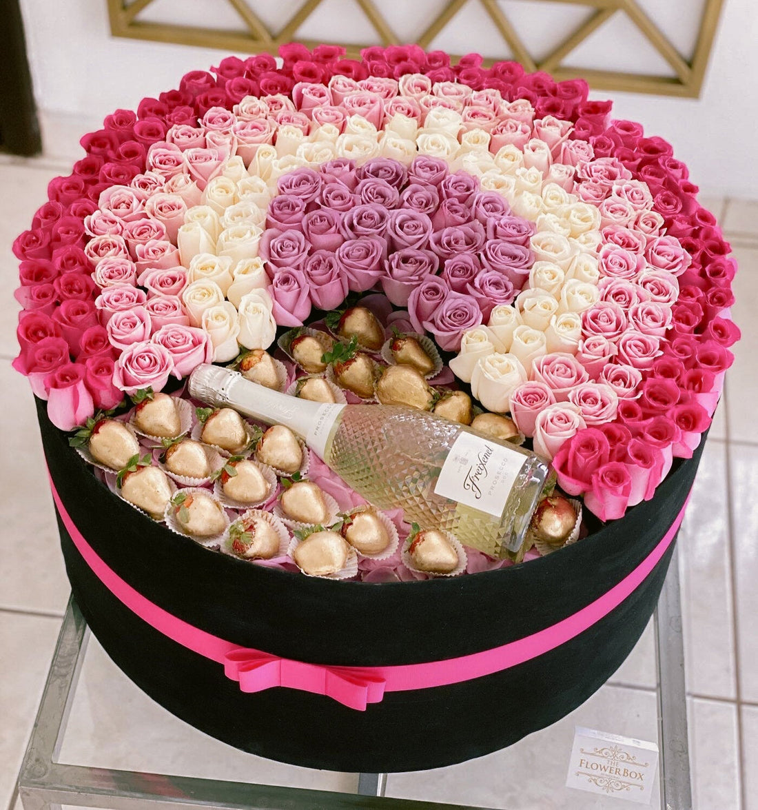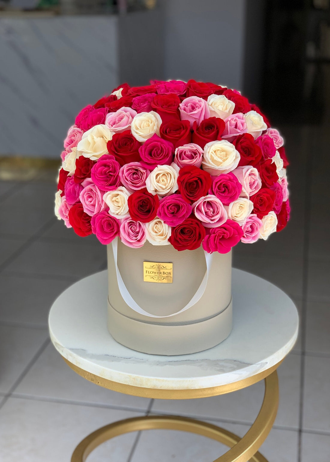 Nuestra caja diseñado con rosas frescas en nuestra caja clásica cilíndrica. Contiene de 20-24 rosas....