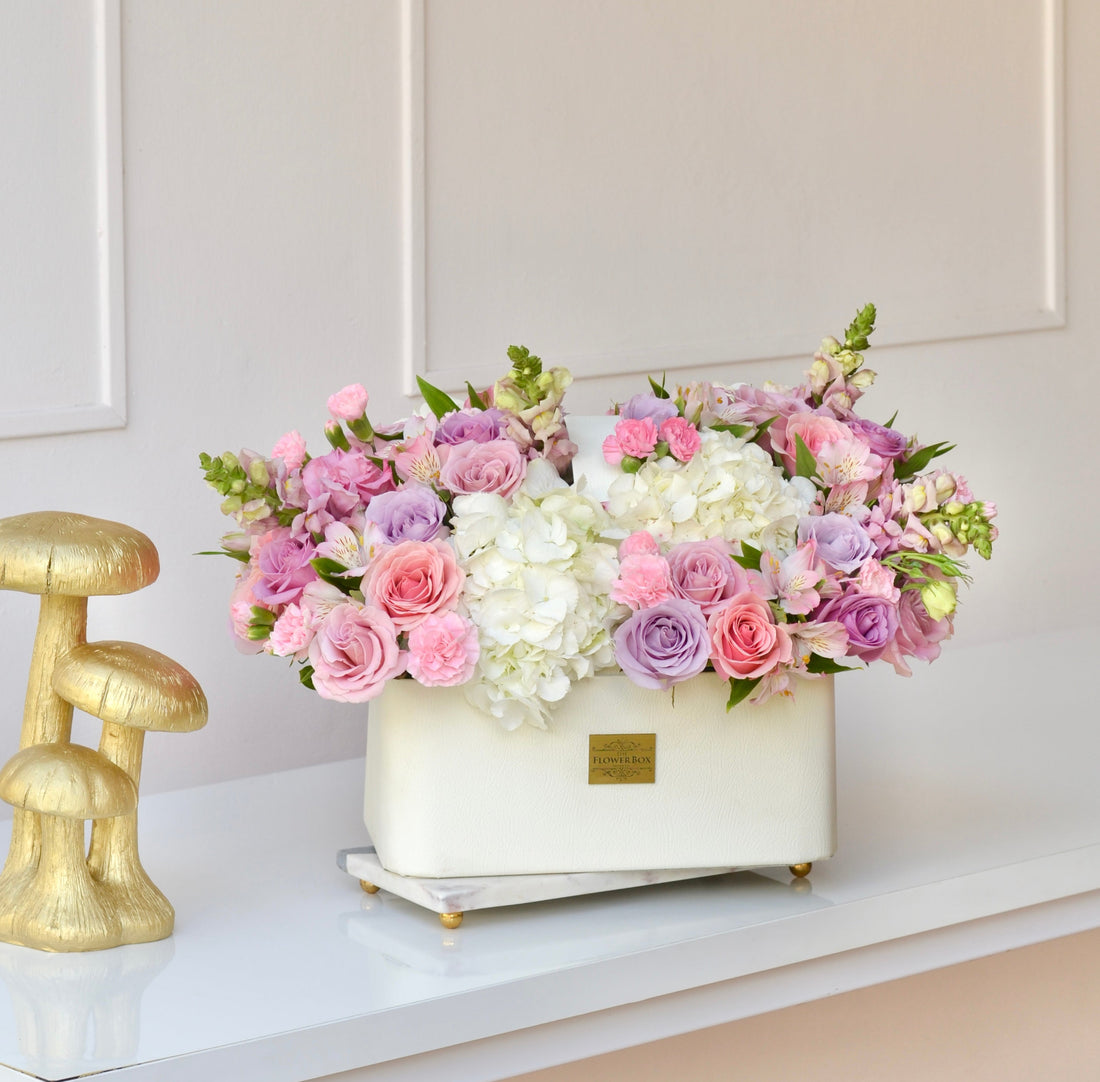 Nuestra caja “Spring Basket” disponible en una sofisticada caja de cuero blanco con rosas y...