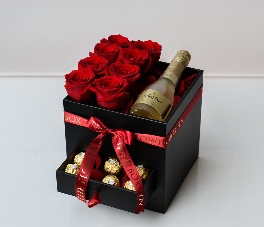 Nuestro arreglo está elaborado en una caja elegante color negro, rosas y una hermosa orquídea...
