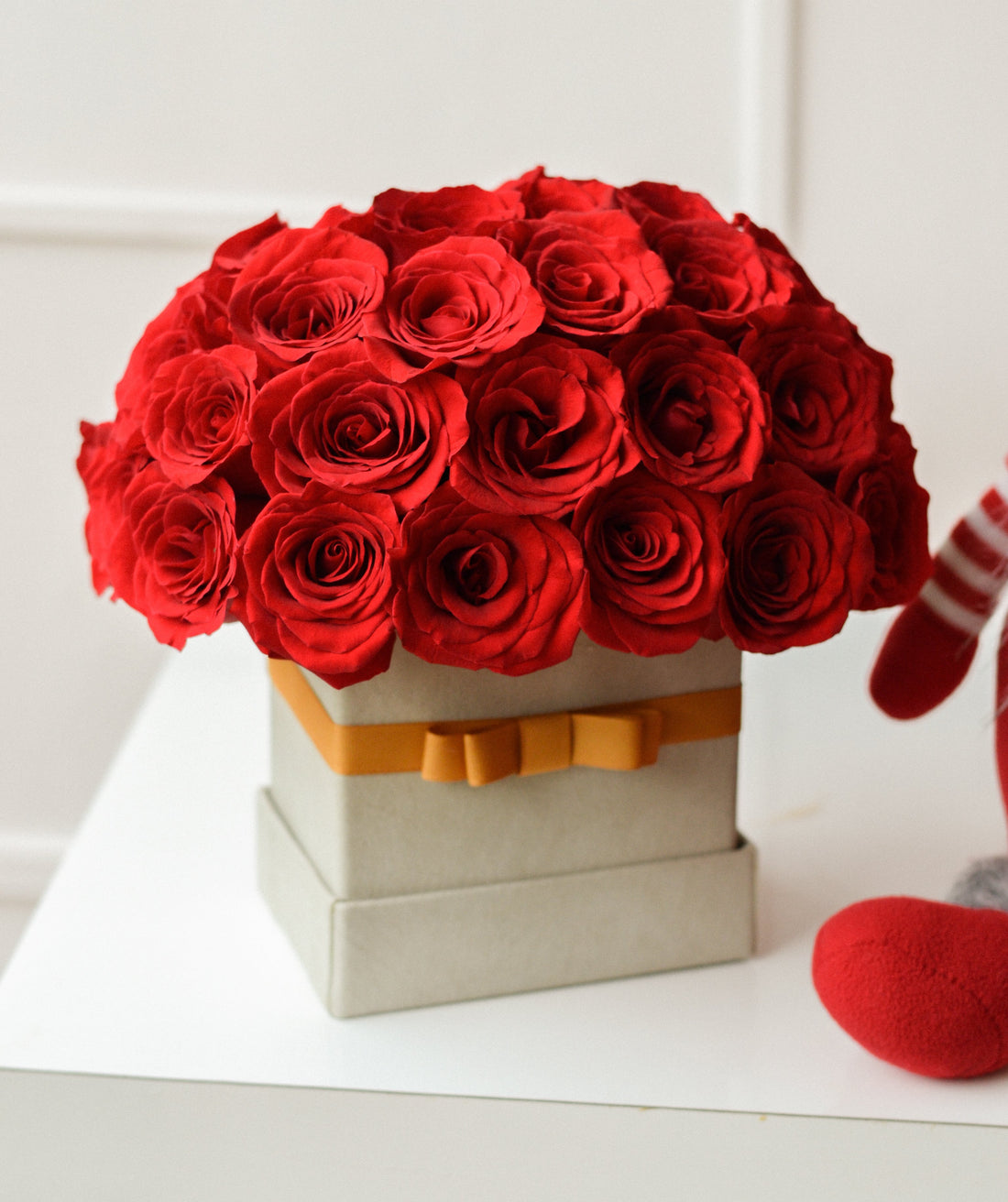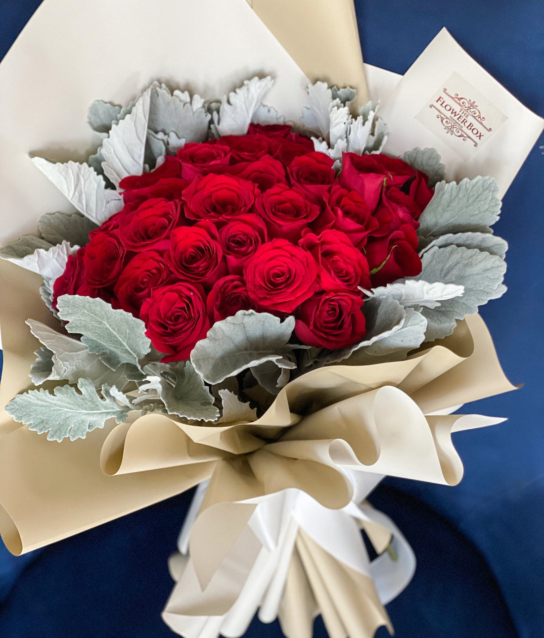 Disponible en una elegante caja, con placa the flower box con el color de rosas rojas....