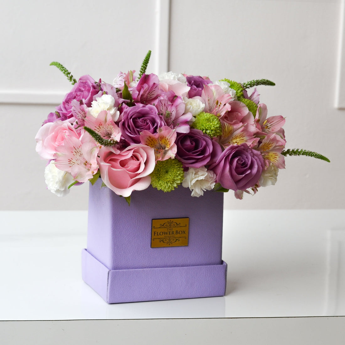 Nuestra caja “Miss Flowerbox” disponible en una sofisticada caja de cuero beige con flores mixtas...