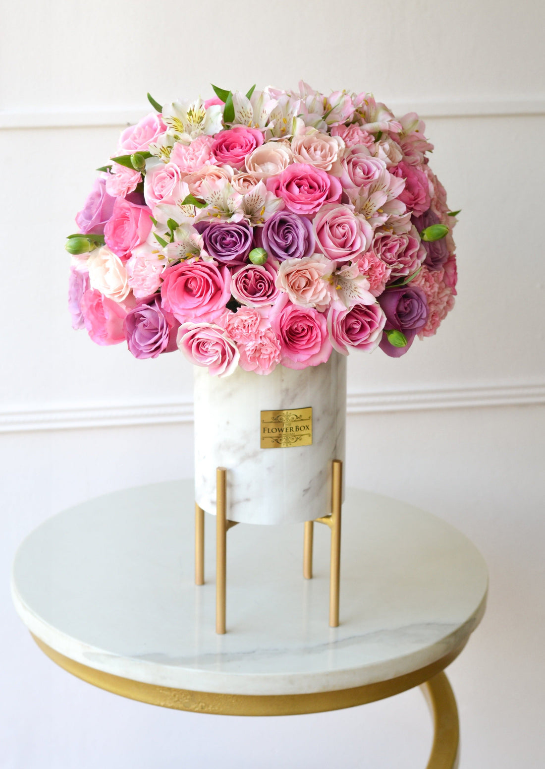 Nuestro arreglo “Pink Monarch” disponible en una sofisticada caja de cuero blanco con un detalle...
