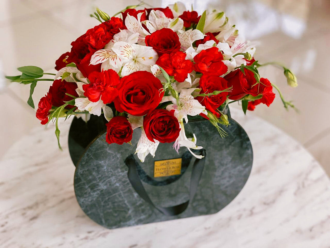 Nuestro arreglo “Marble Purse” disponible en una sofisticada caja de mármol negra, rosas y astromelias....