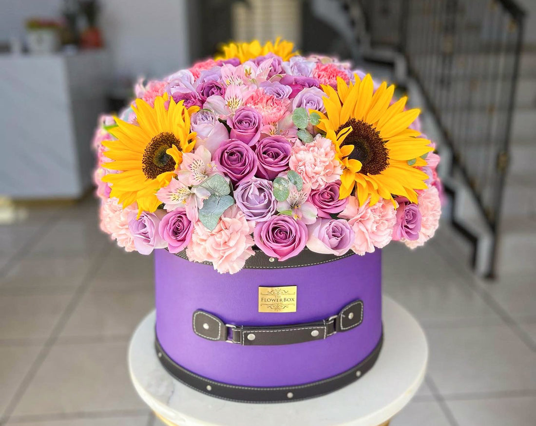 Nuestra caja disponible en una sofisticada caja de cuero morado con girasoles, claveles y hortensias...