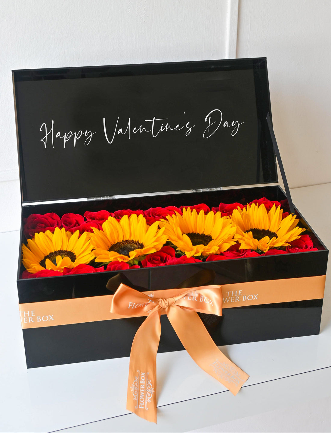Nuestra caja disponible en una sofisticada caja de cuerina negra con rosas rojas y girasoles....