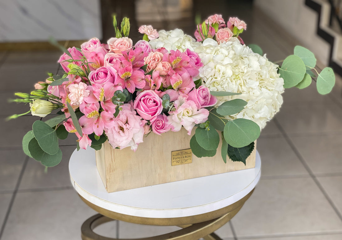 Nuestra nueva caja Rosewood es perfecta para cualquier ocasión. Elaborado con flores frescas en tonos...