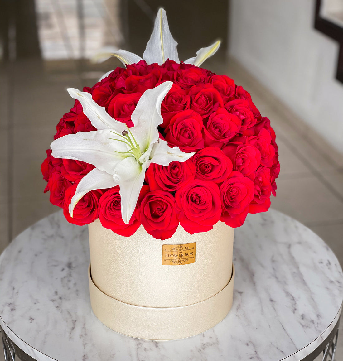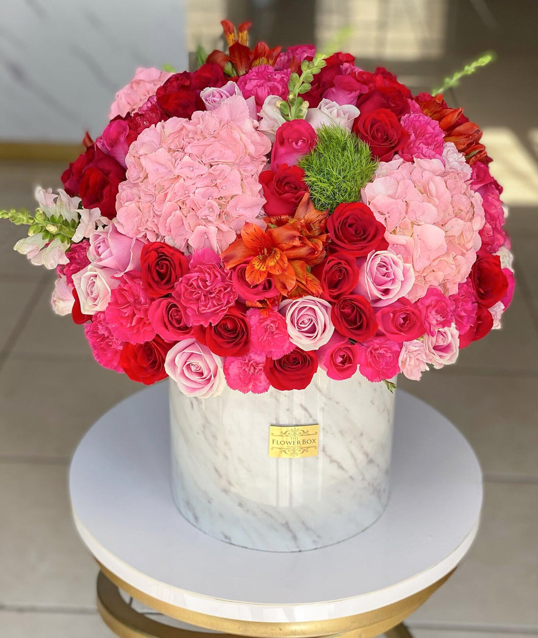 Nuestro arreglo “Red Lux Marble” viene disponible en una sofisticada caja de formica mármol blanco...