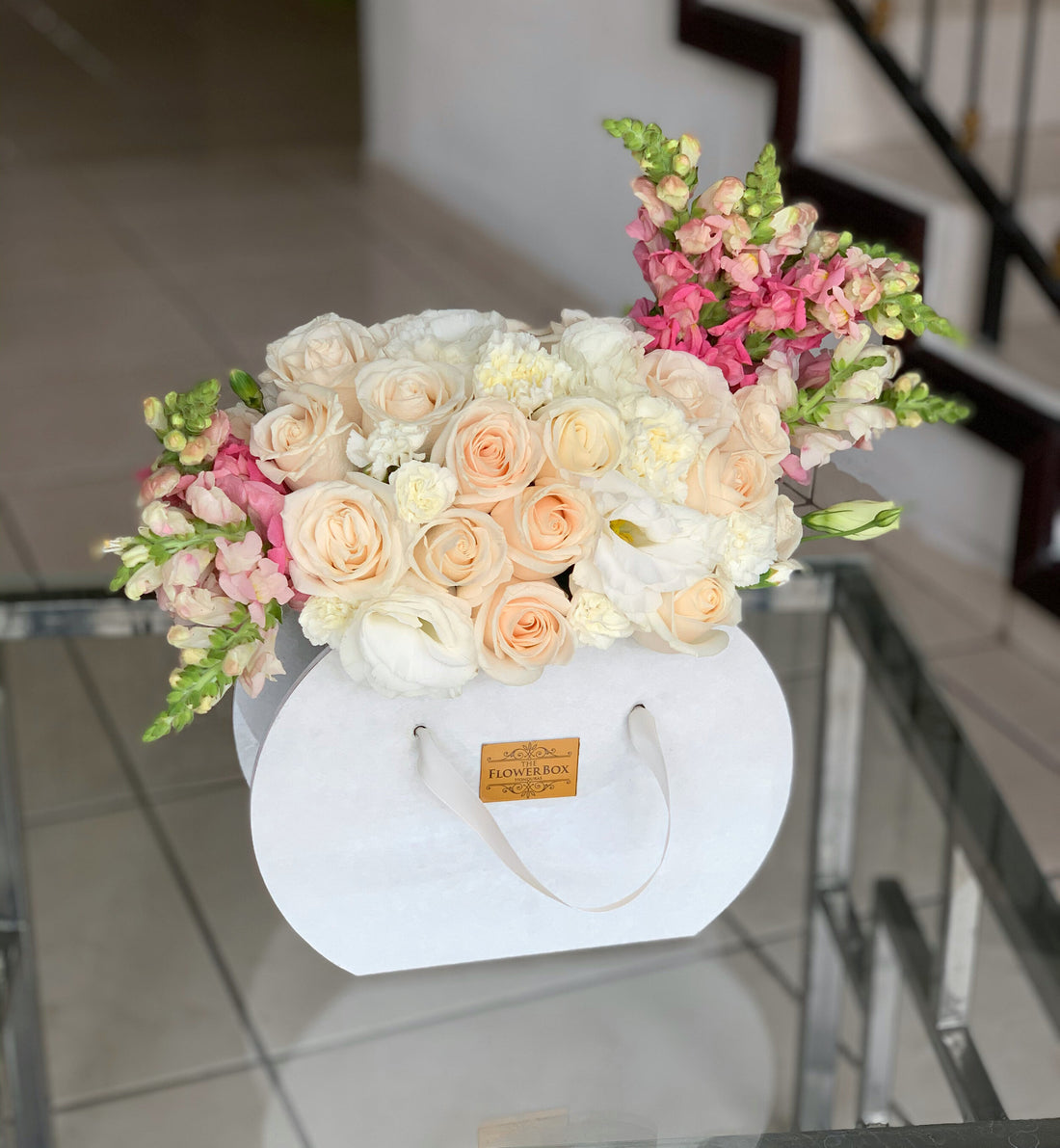Nuestro arreglo “Pink detail purse” disponible en una sofisticada caja con base blanca y flores...