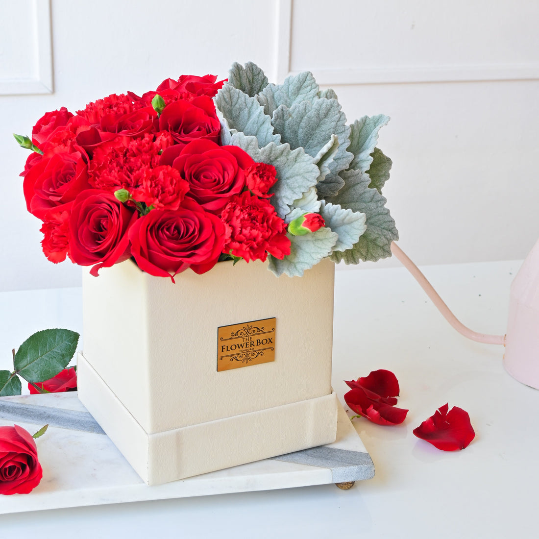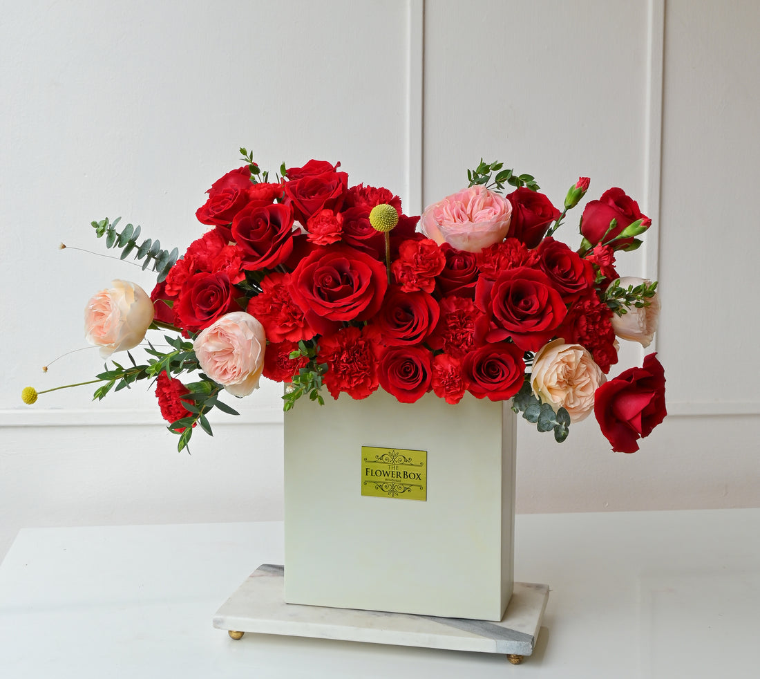 Sofisticación en cada detalle: Rosas rojas premium, combinadas con follaje fresco y flores vibrantes. Caja...