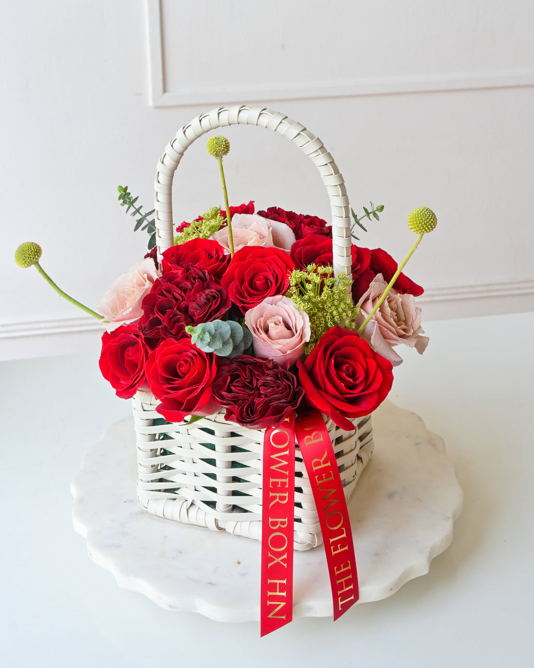 es un hermoso arreglo floral presentado en una caja en forma de canasta en tonos...