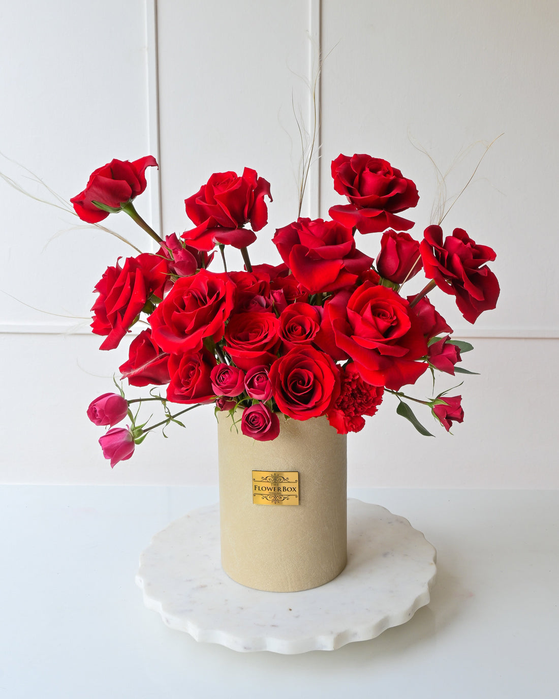 Sorprende con un toque de sofisticación y elegancia con Velvet Bloom: Rosas rojas, rosadas y...