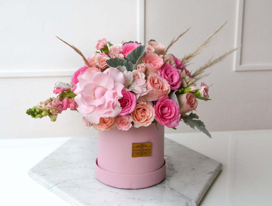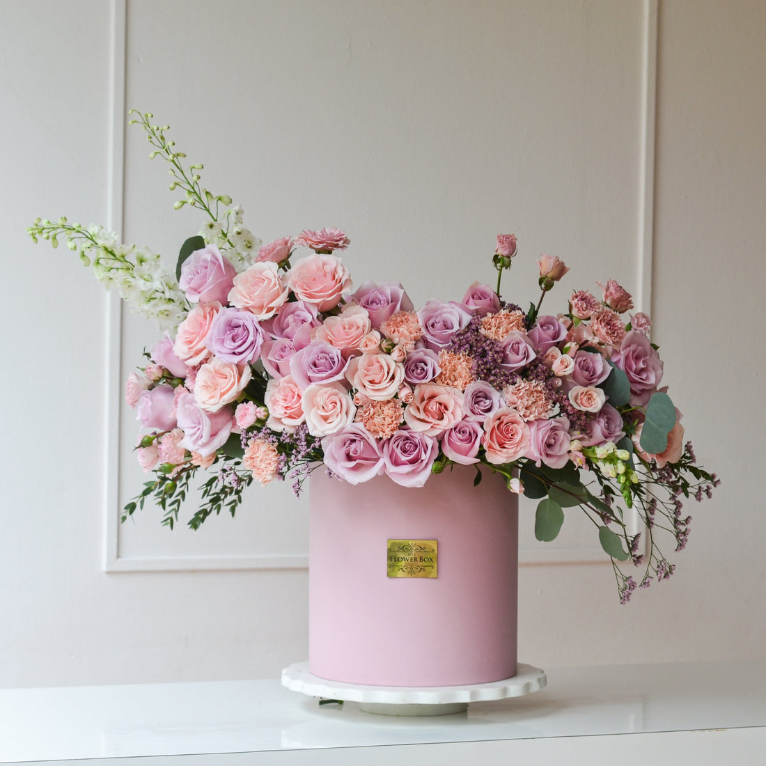 Nuestro Pink Isabella es un arreglo floral encantador en una caja rosada, que incluye una...