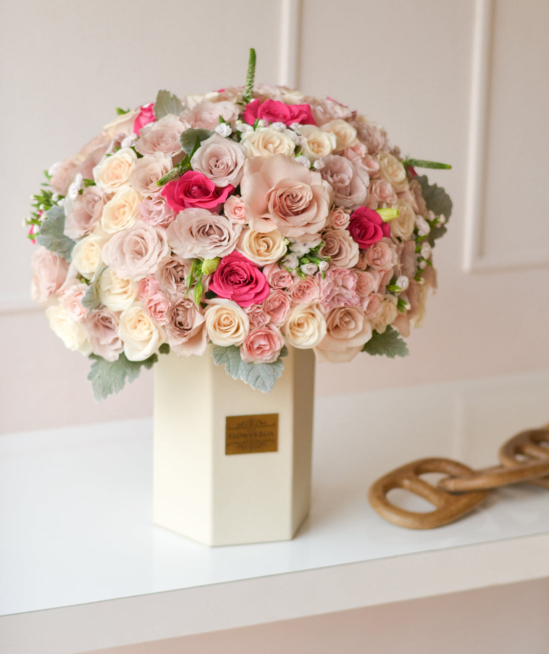Pink Charmer, un hermoso arreglo floral en tonos rosados, presentado en nuestra icónica base de...