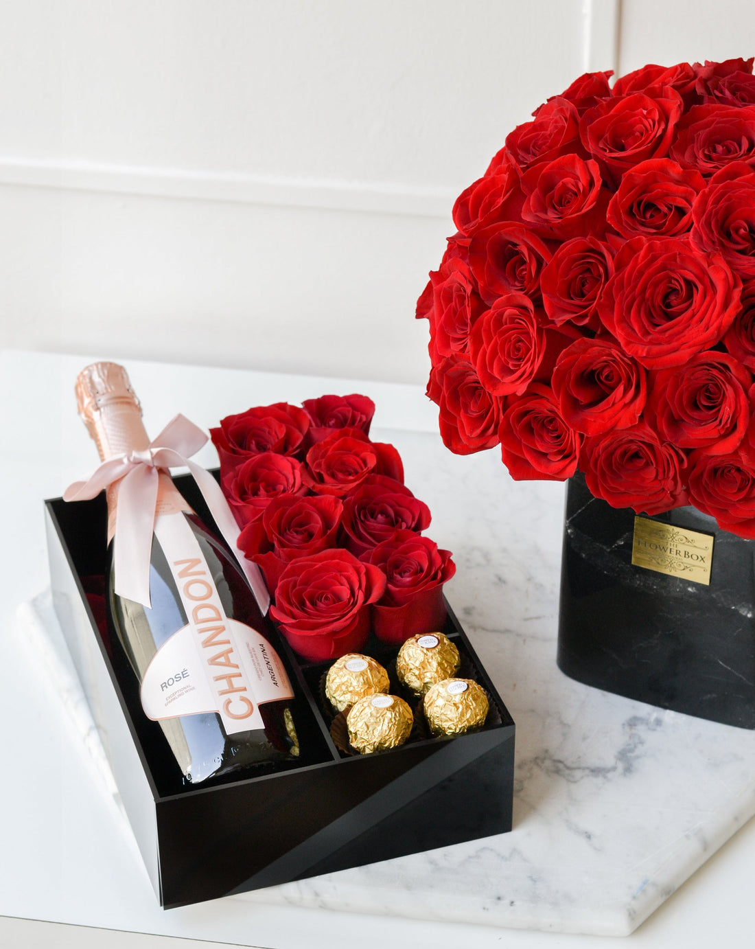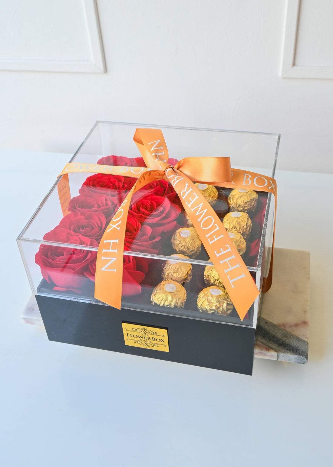 Disponible en una elegante caja, con placa the flower box con el color de rosas rojas. Detalles...