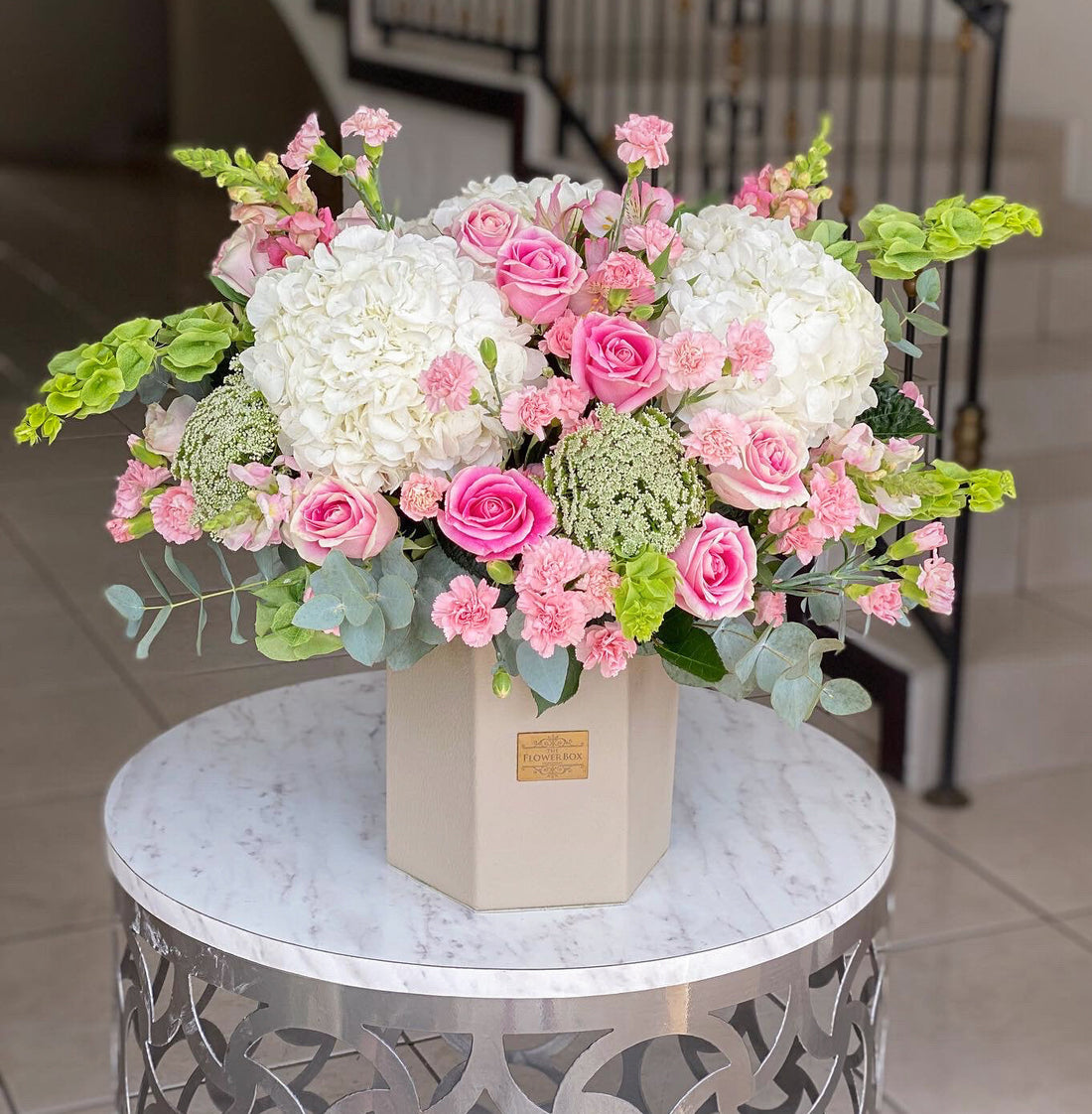 Nuestro arreglo disponible en una sofisticada caja cuero blanco acompañado con hortensias, rosas, y claveles....