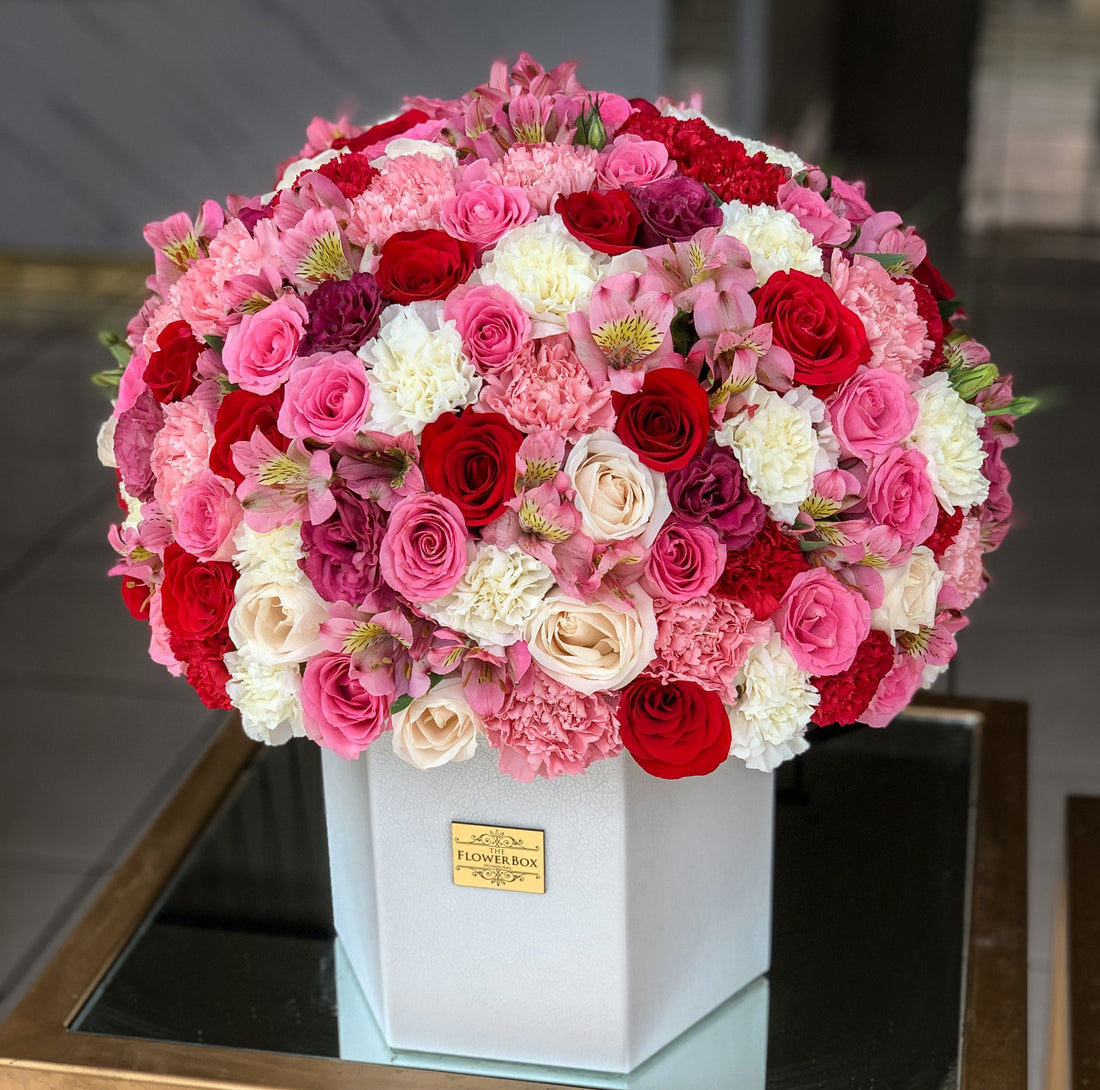 Nuestra caja “Red Berries” disponible en una sofisticada caja de cuero blanco con flores mixtas...