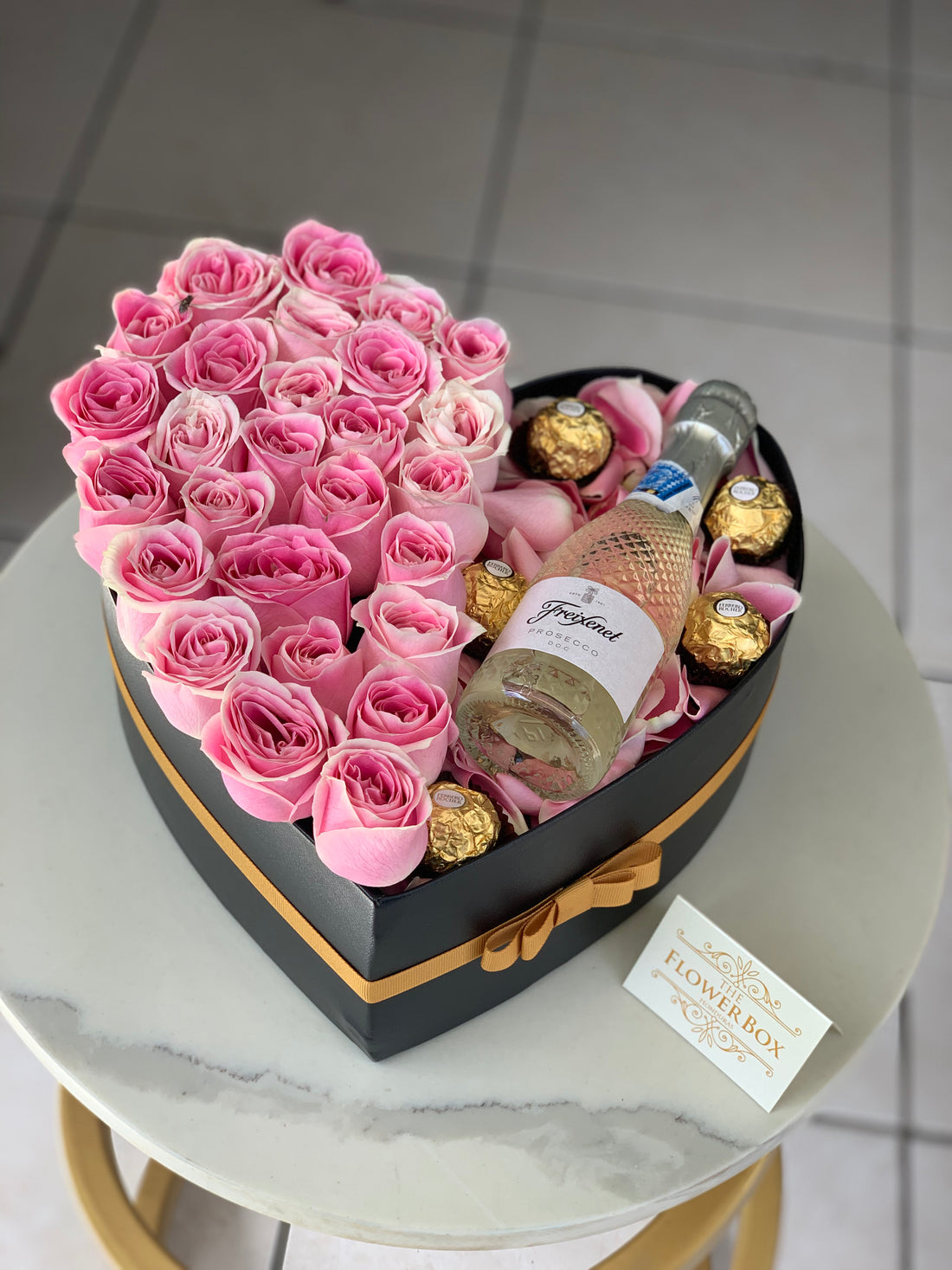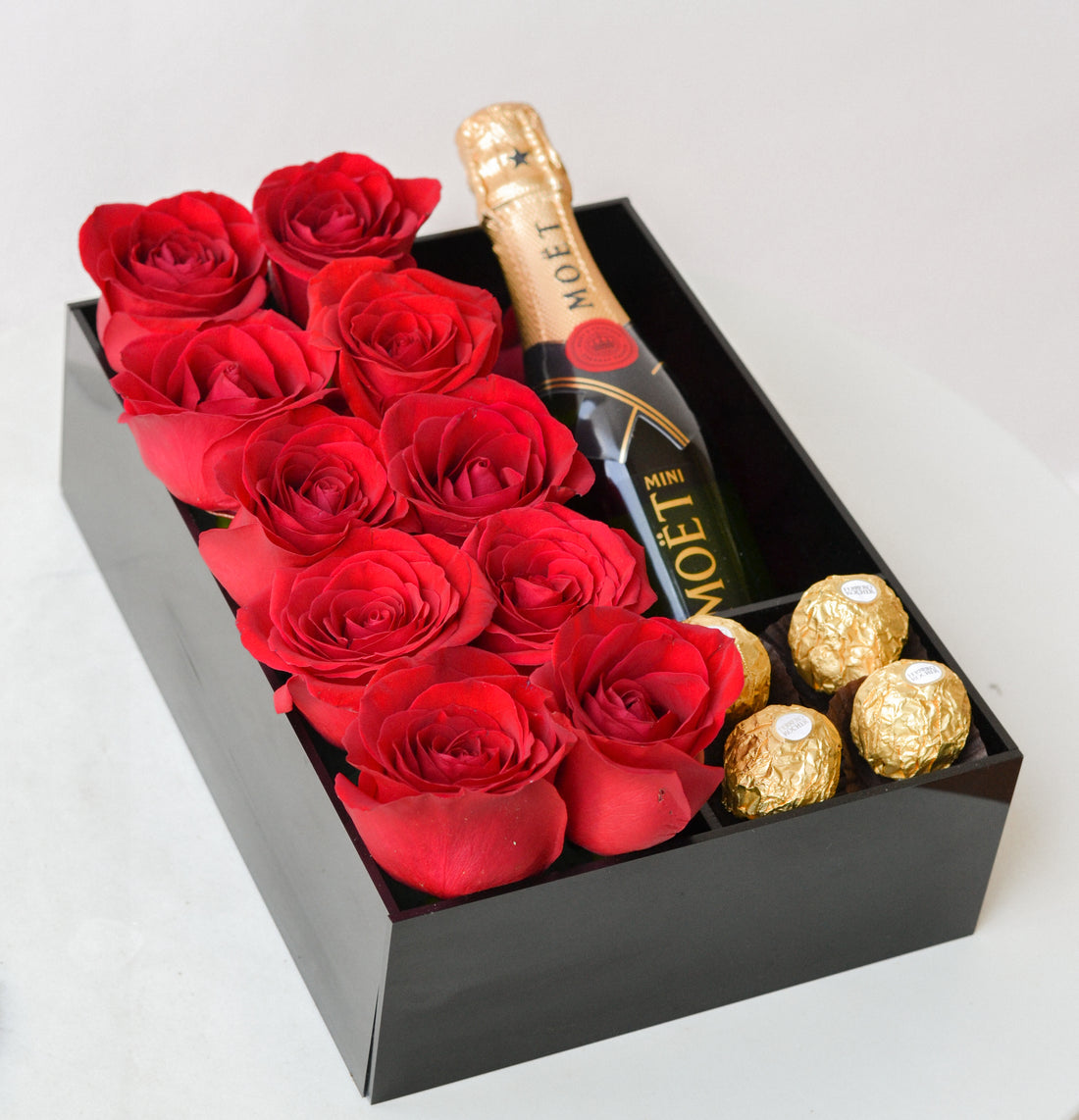 Nuestro arreglo está elaborado en una caja con rosas rojas una botella de Mini Möet (depende...