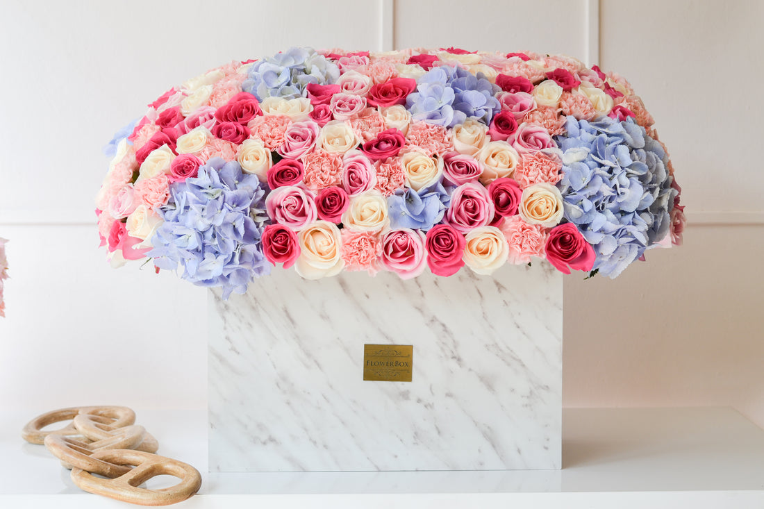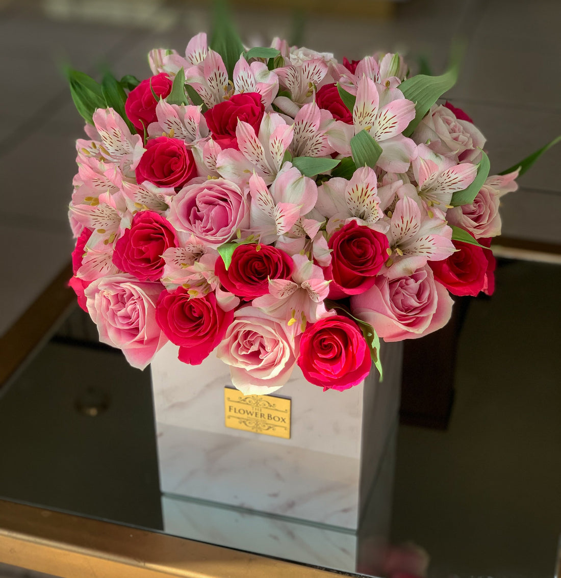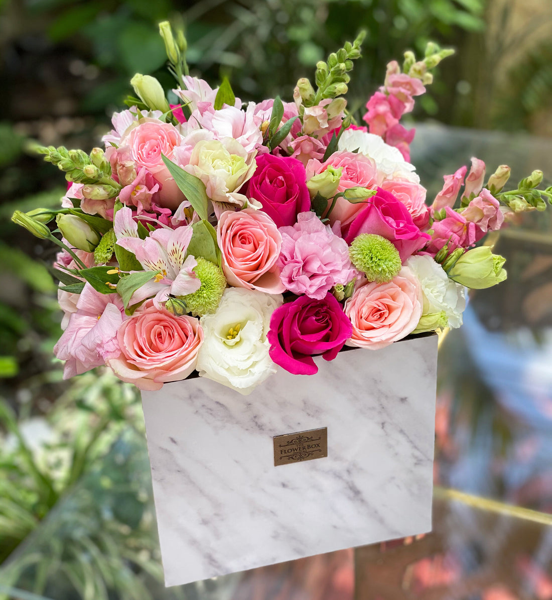 Nuestro arreglo “Pink Eden” disponible en una sofisticada caja de mármol blanco y base dorada....