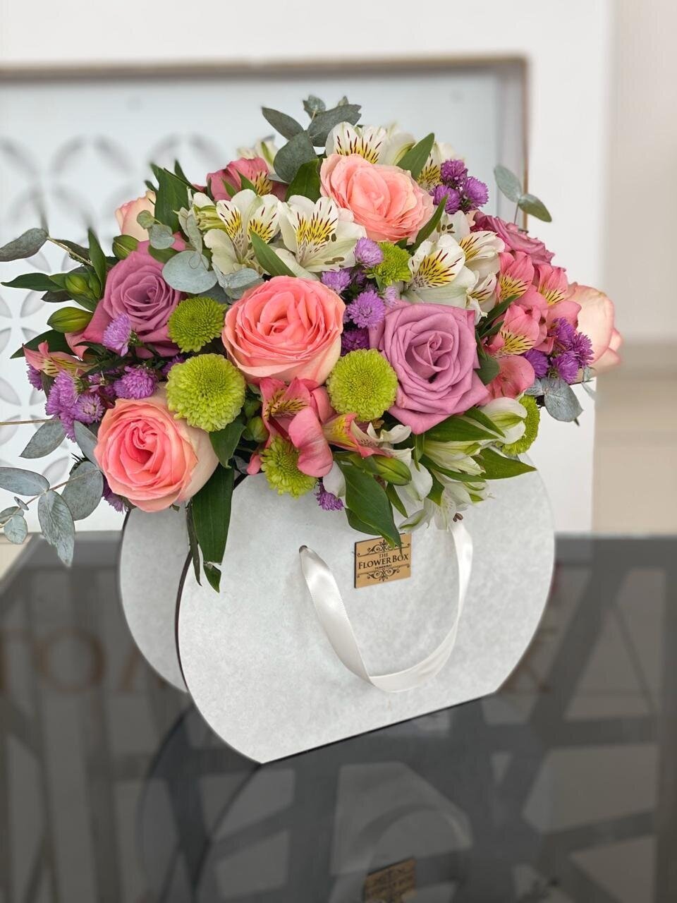 Nuestro arreglo “Pink detail purse” disponible en una sofisticada caja con base blanca y flores...