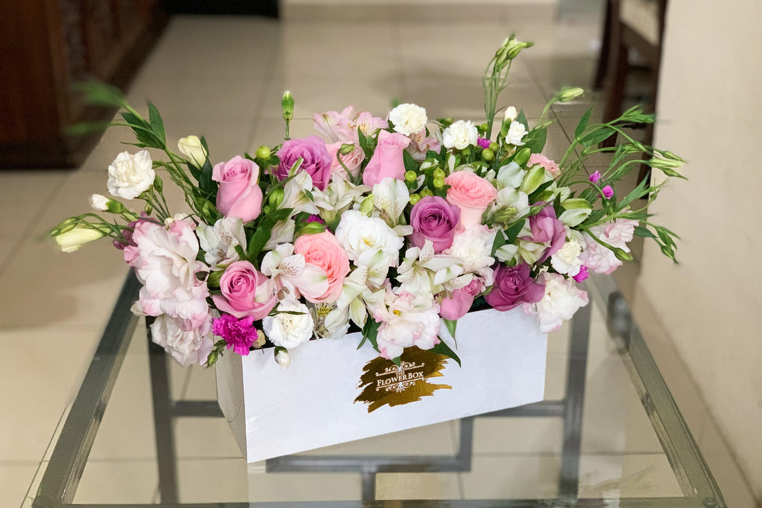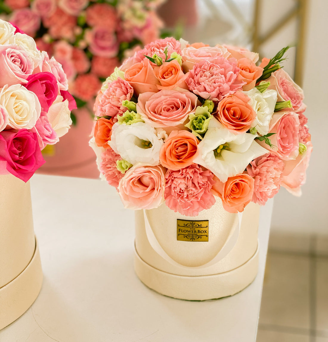 Nuestra caja “Molly Basket” disponible en una sofisticada caja de cuero blanco con flores mixtas...