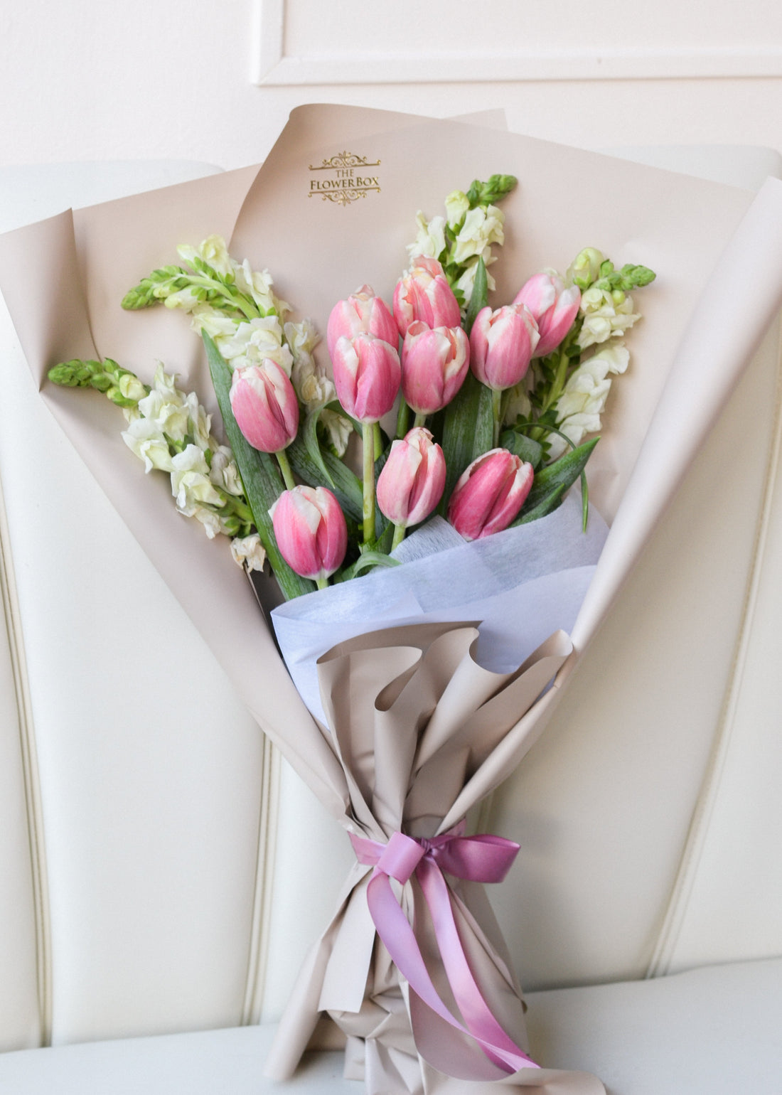 Nuestro hermoso bouquet de tulipanes frescos y boca de dragón acompañado de nuestro papel luxury...