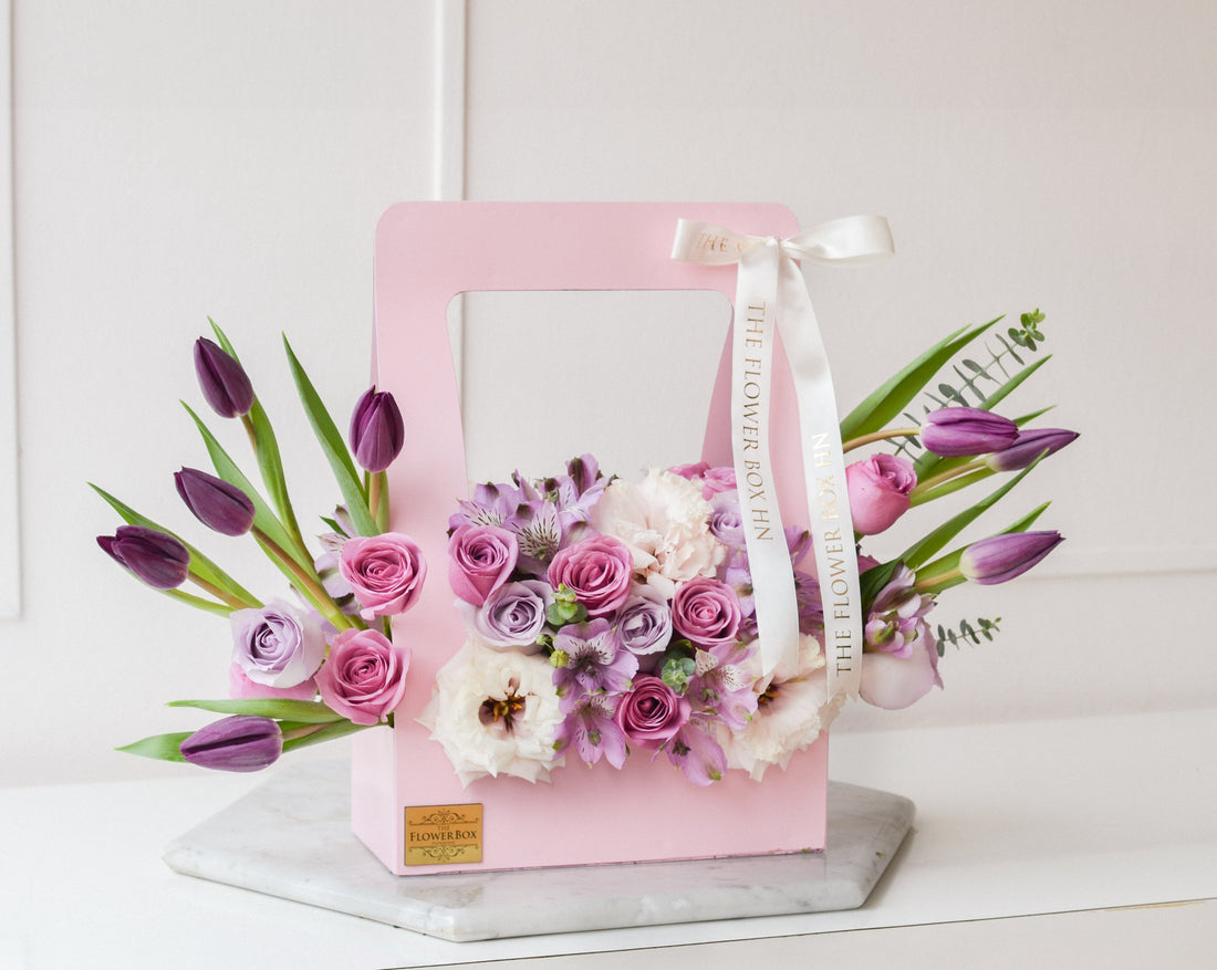 Nuestra caja “Signature Basket” disponible en una sofisticada caja con tulipanes, rosas y astromelias Flores...