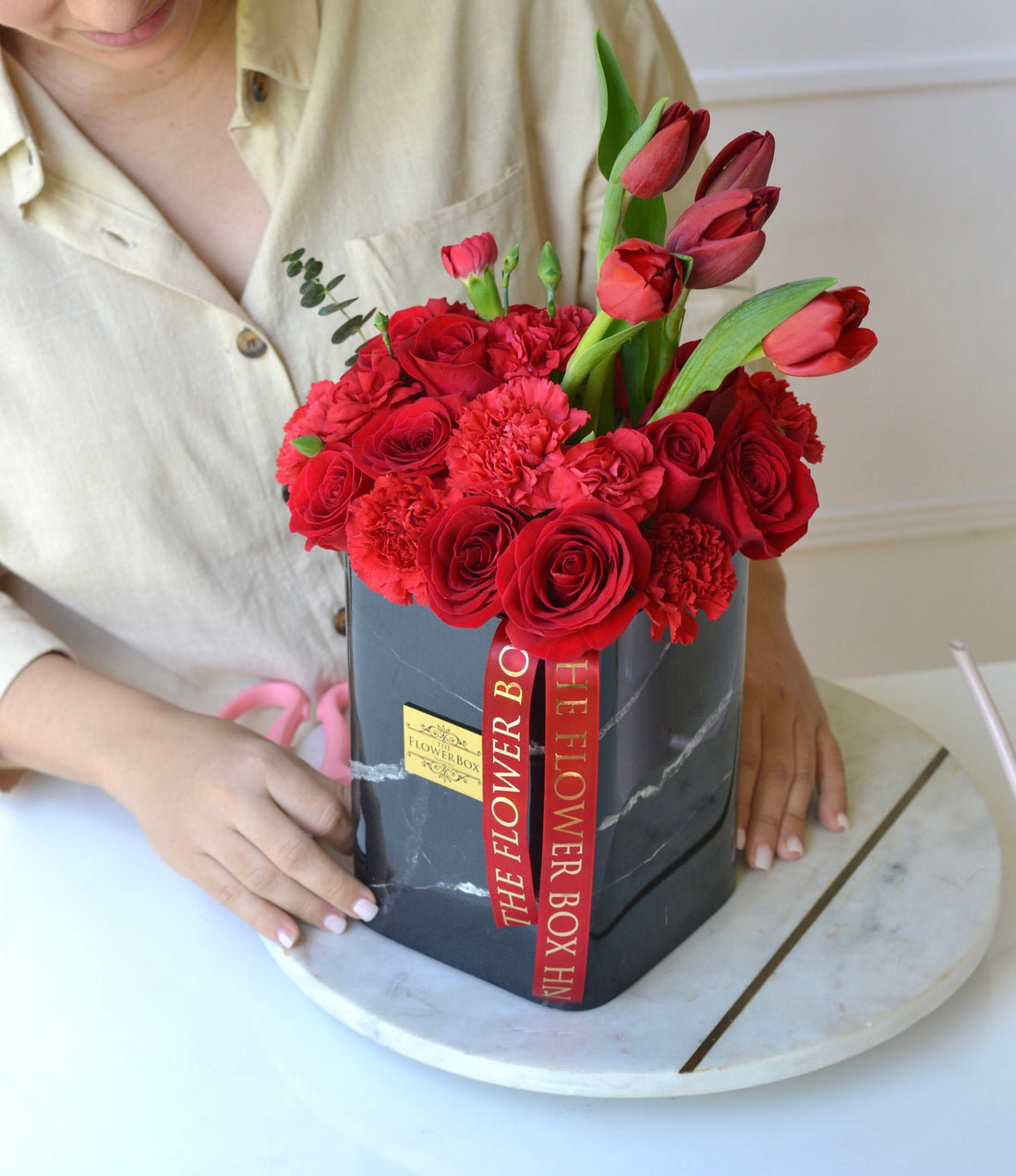 Nuestra caja “Signature Basket” disponible en una sofisticada caja con tulipanes, rosas y astromelias Flores...