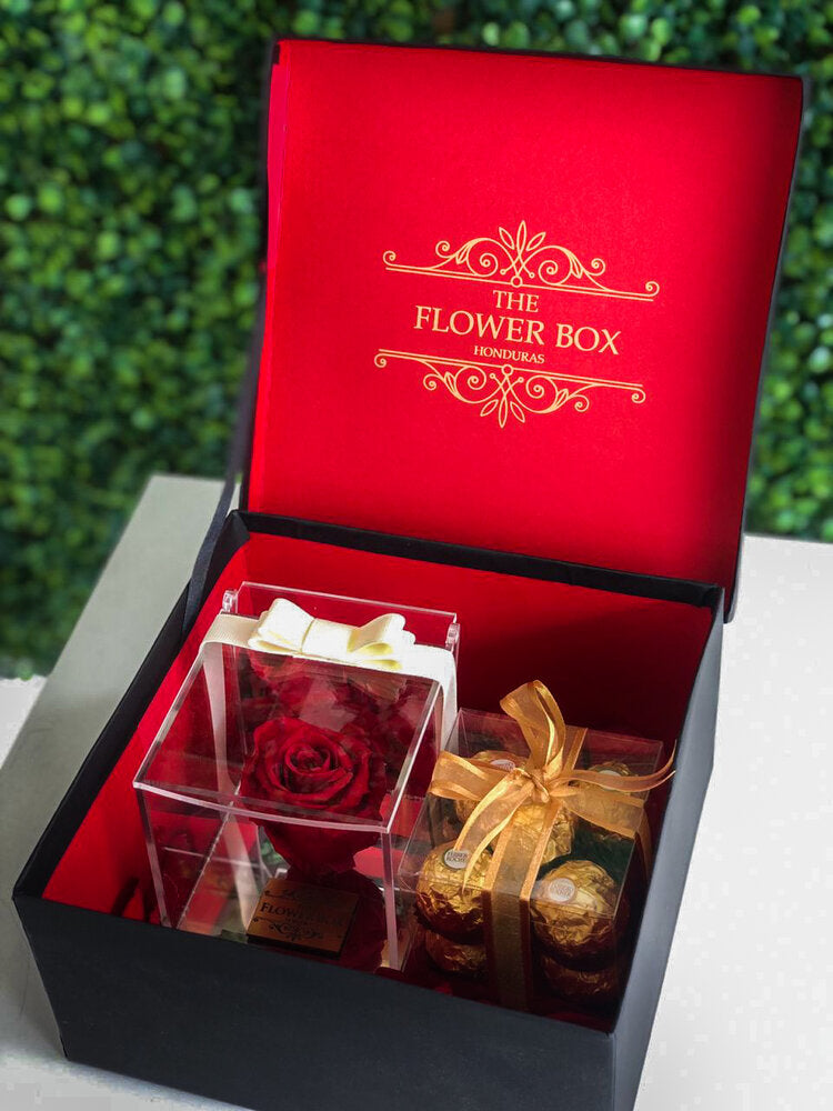 Disponible en una elegante caja, con placa the flower box con el color de rosas rojas. Detalles...