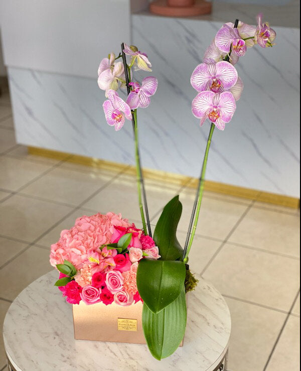 Nuestro arreglo está elaborado en una caja elegante color negro, rosas y una hermosa orquídea...