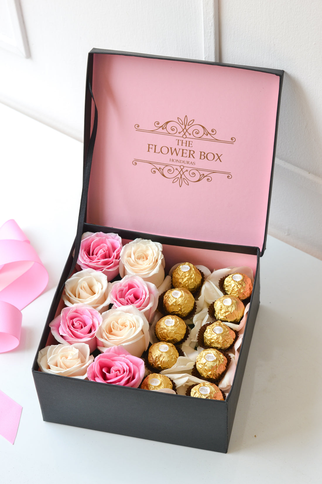 Nuestro arreglo “Eiffel Box” disponible en una sofisticada cuero peach con mensaje personalizado y chocolates...