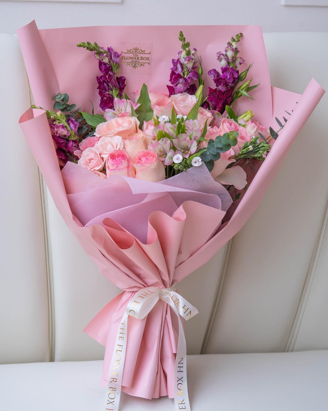Charming bouquet con combinación de rosas rosadas suave, astromelias rosadas, detalles de snap dragon, raffine...