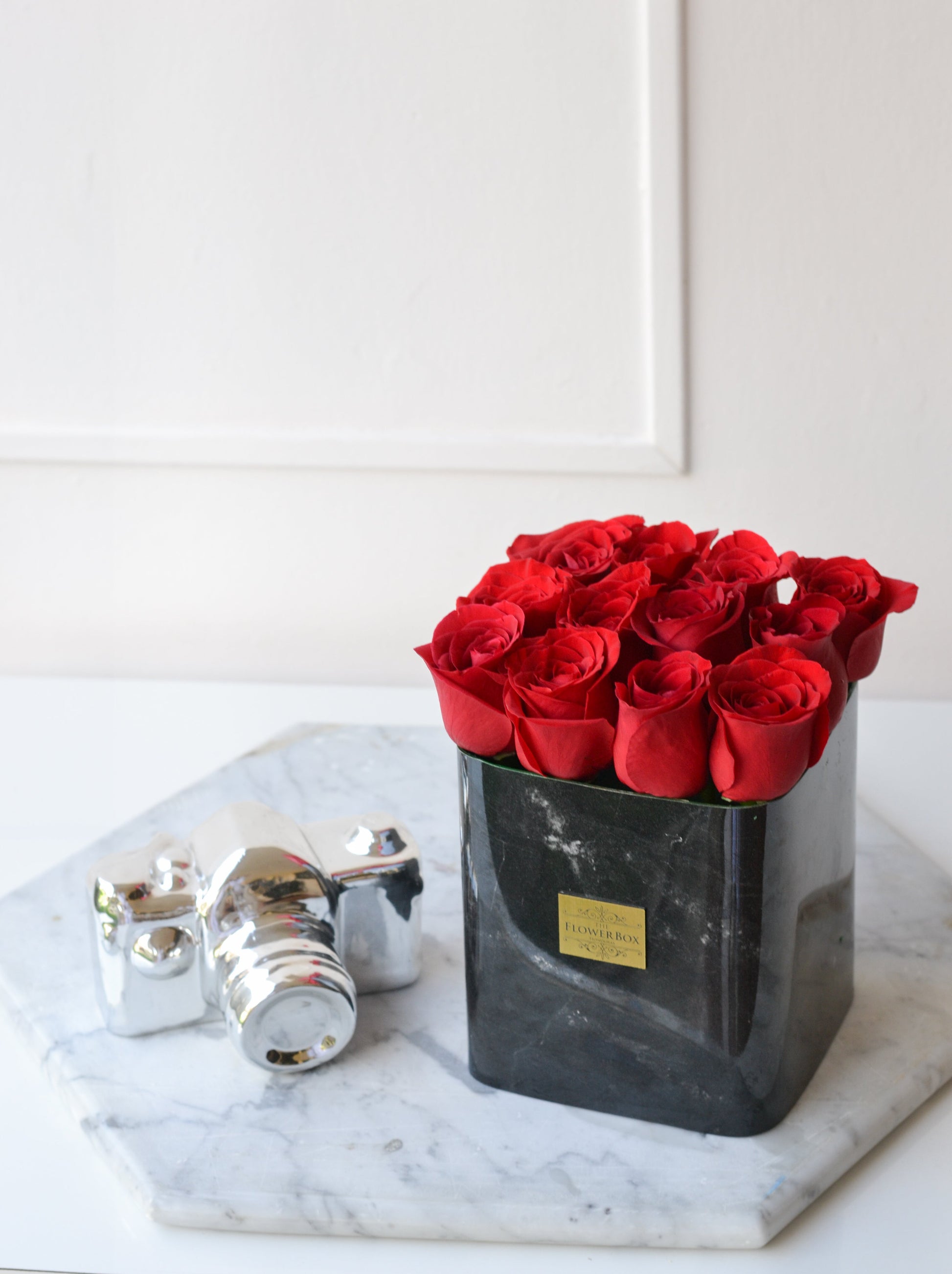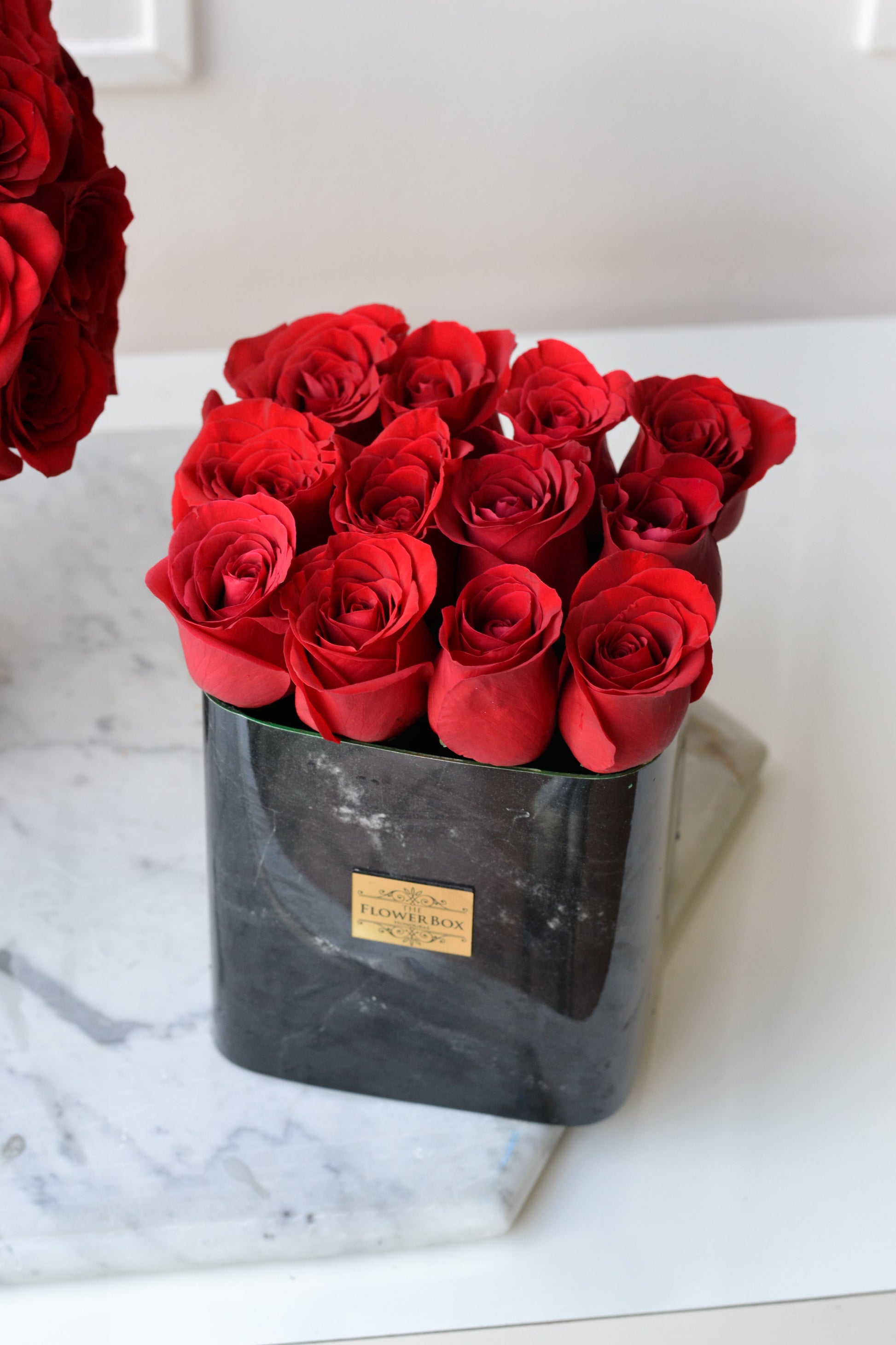 Nuestro nuevo arreglo "12 am" viene disponible en una sofisticada caja de mármol negro acompañado por rosas rojas.