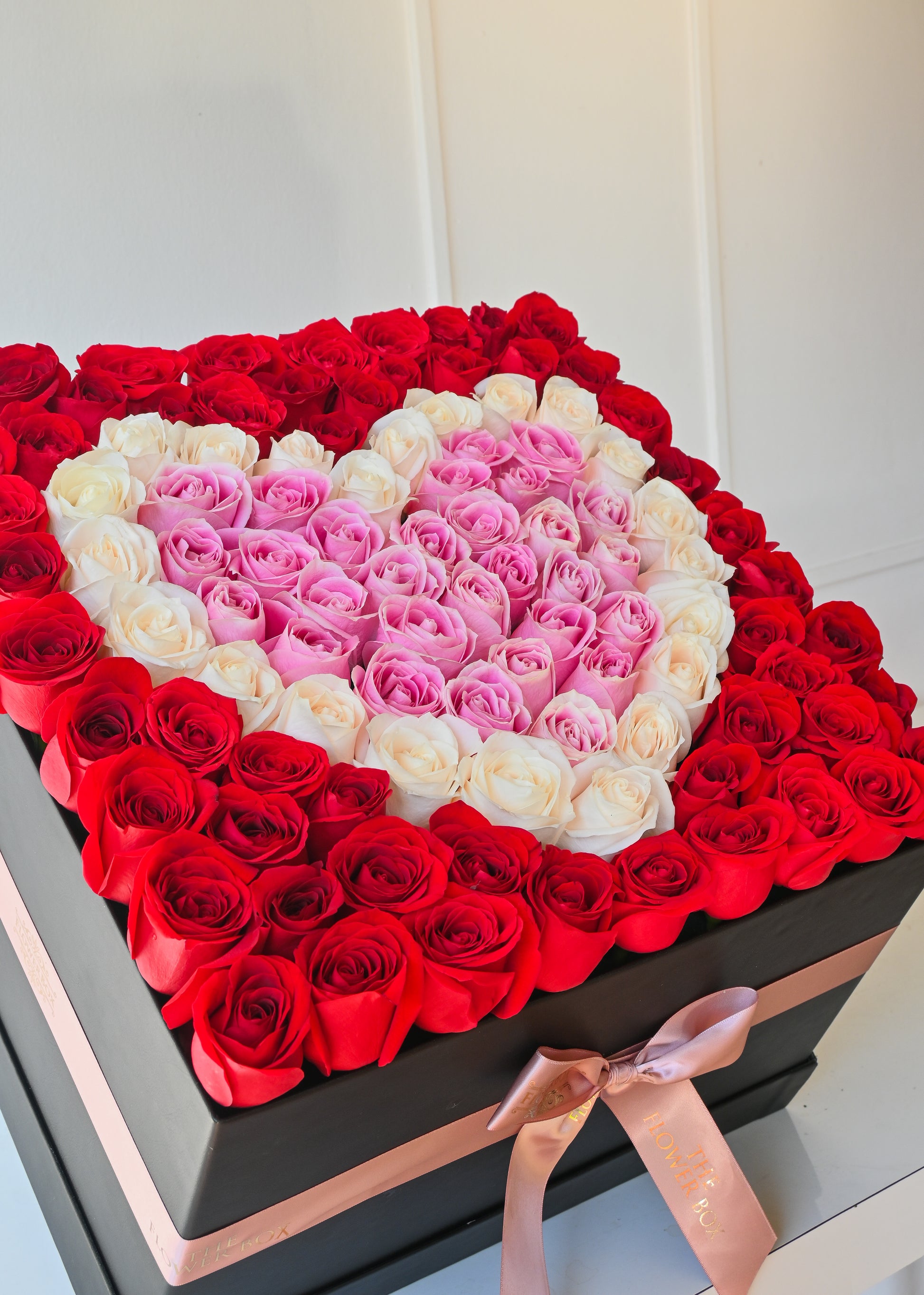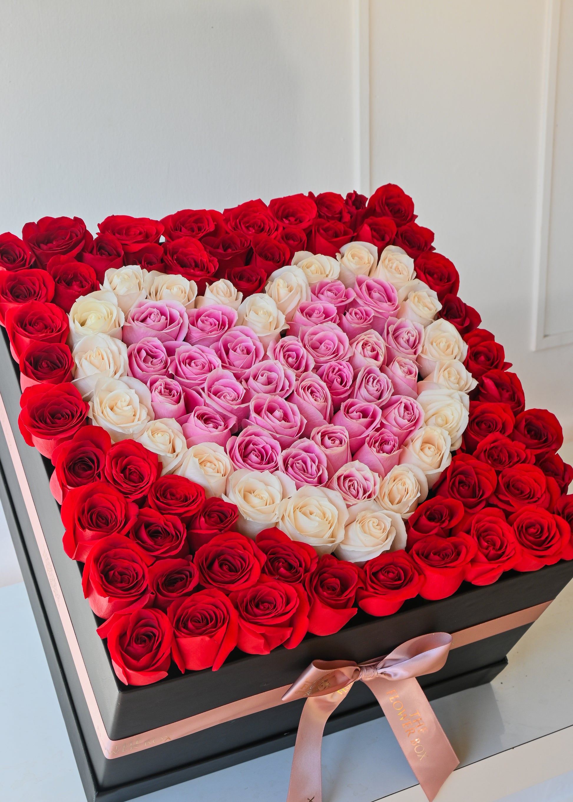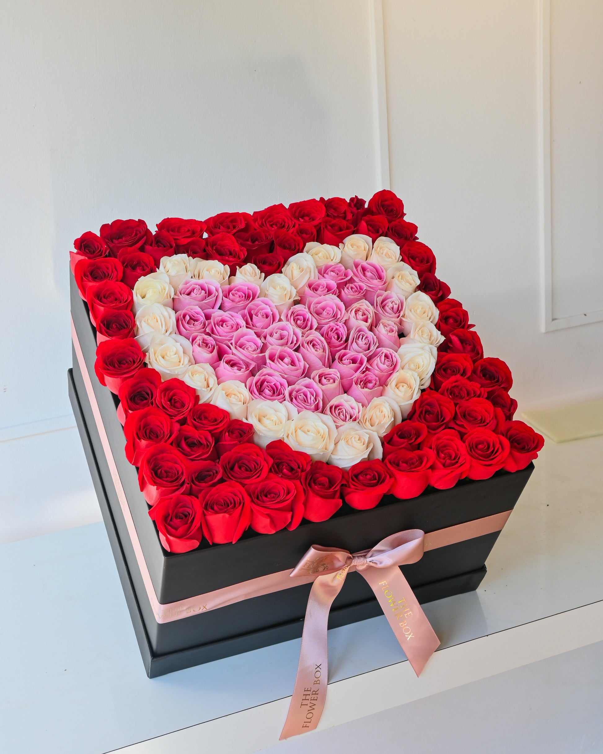 • Rosas premium en tonos rojos, blancos y rosas, formando un hermoso corazón.