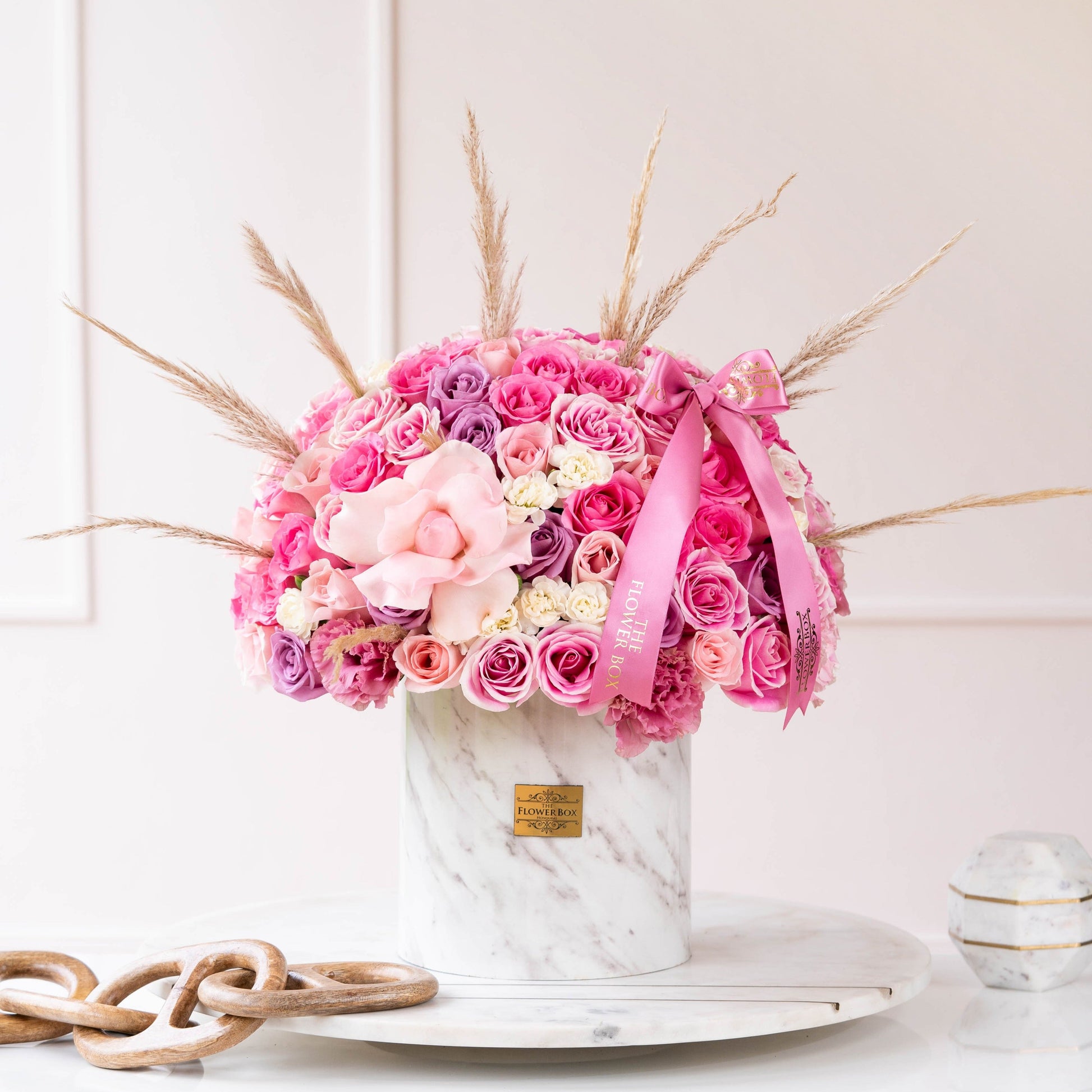 Nuestra nueva aesthetic box viene acompañado de ramas de pampa grass en tonos rosado, rosas y nuestra icónica caja de mármol en acrílico