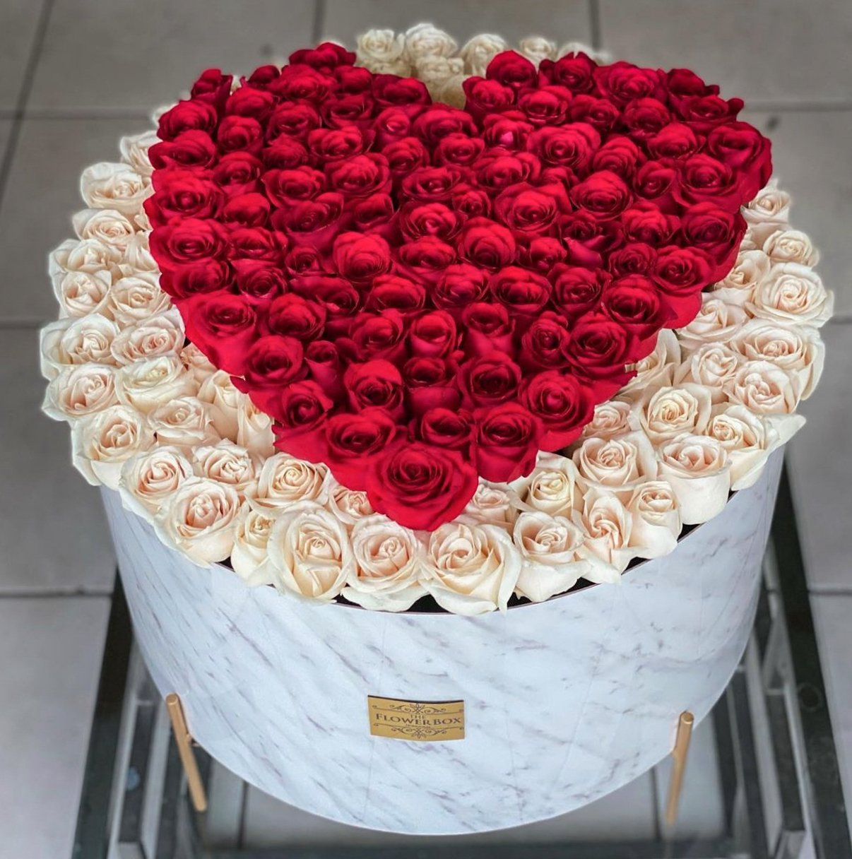 Caja de formica de mármol acompañado de rosas blancas y rojas con detalle de corazón