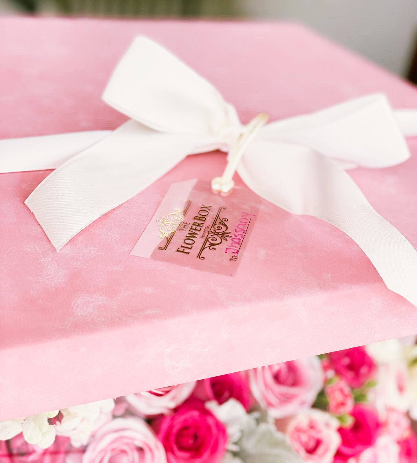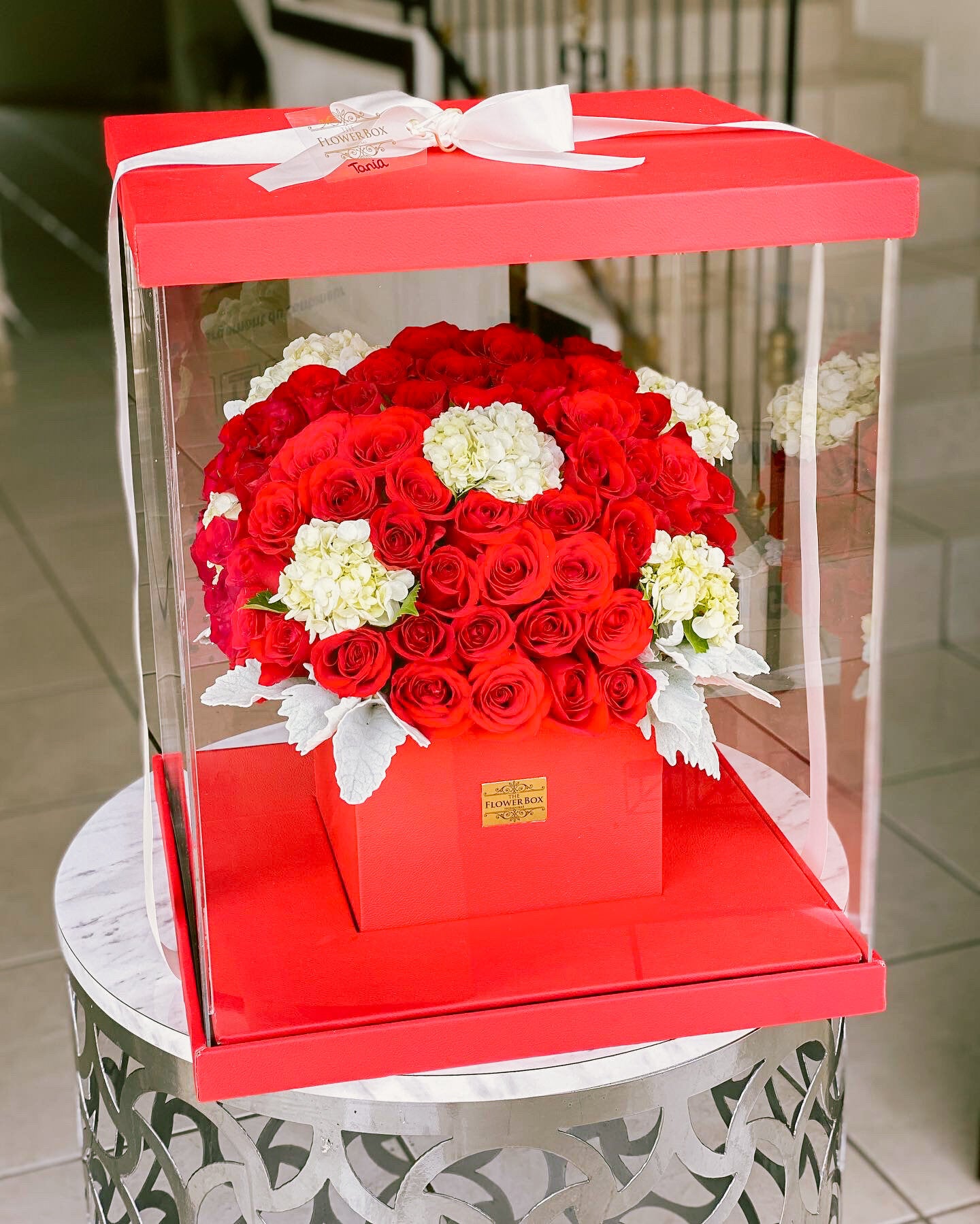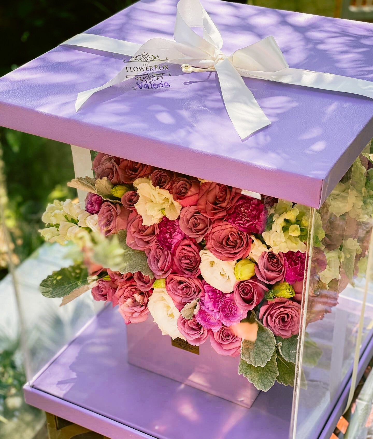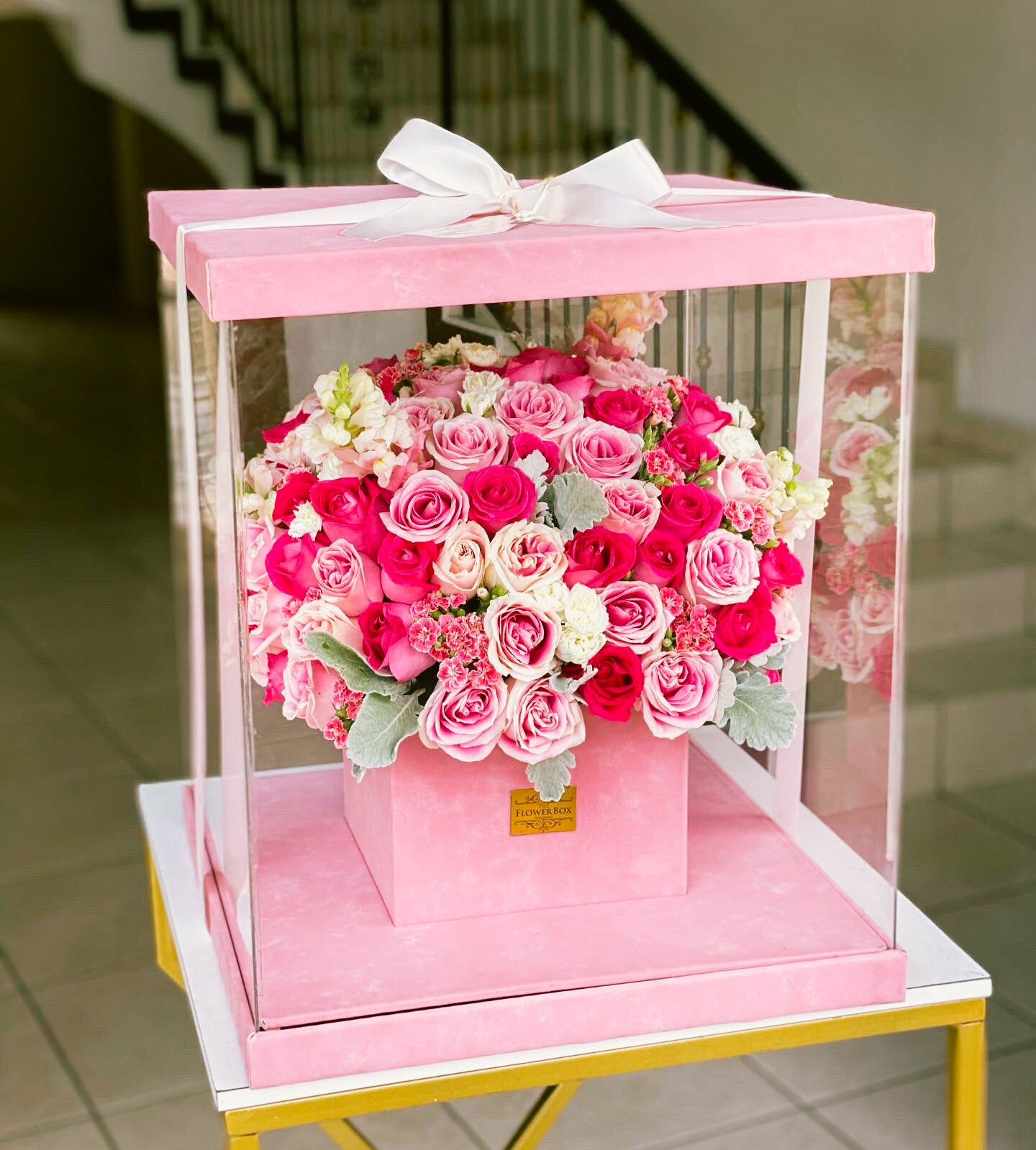 Nuestra caja “Bubble Box disponible en una sofisticada caja de cuero Rosado, Rojo o Morado con un protector de acrílico. El bouquet esta curado con nuestras flores más frescas y colores elegantes.