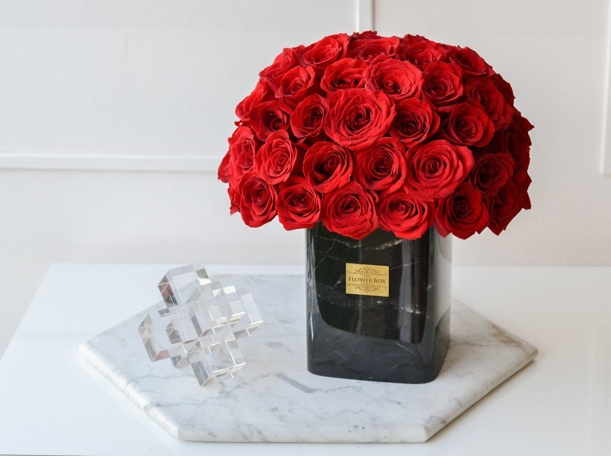 Nuestro arreglo “Midnight Love” disponible en una sofisticada caja de formica mármol negra y rosas rojas
