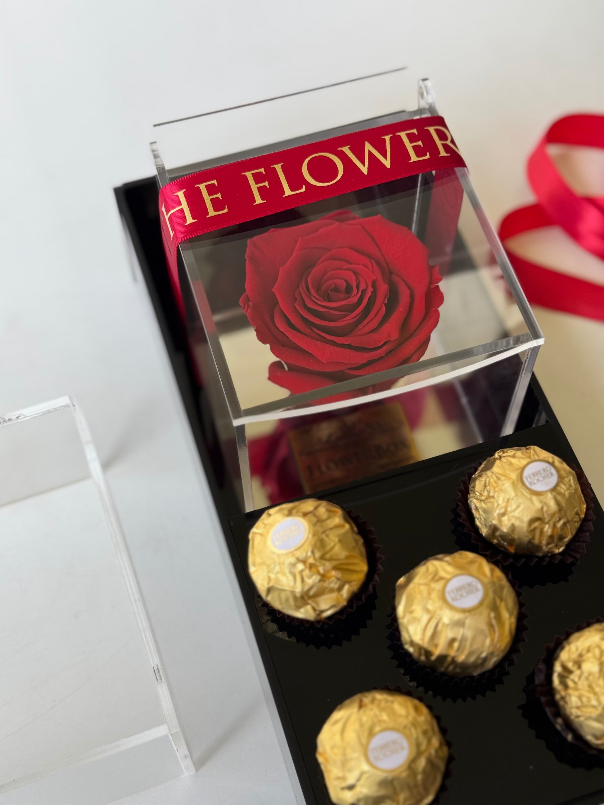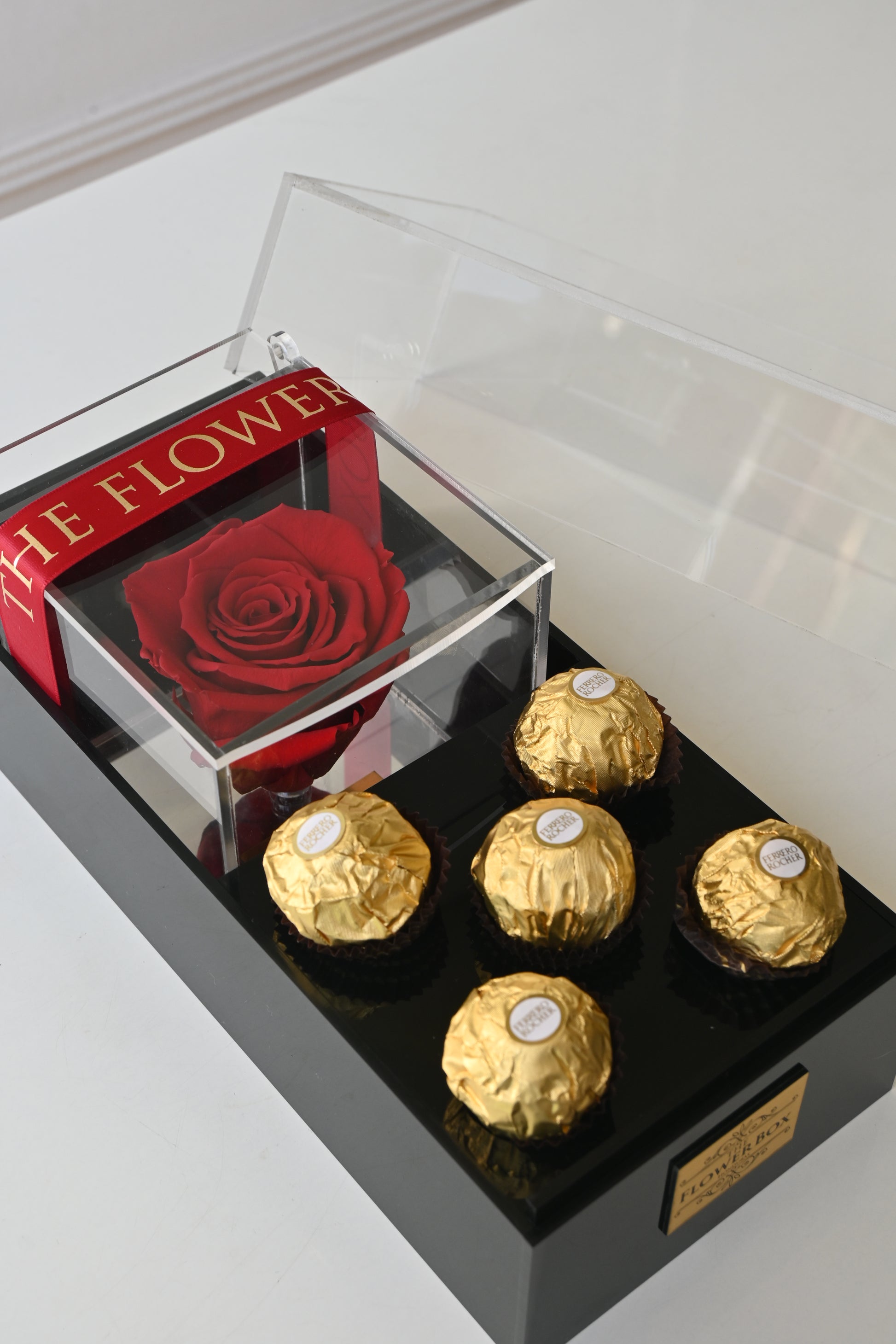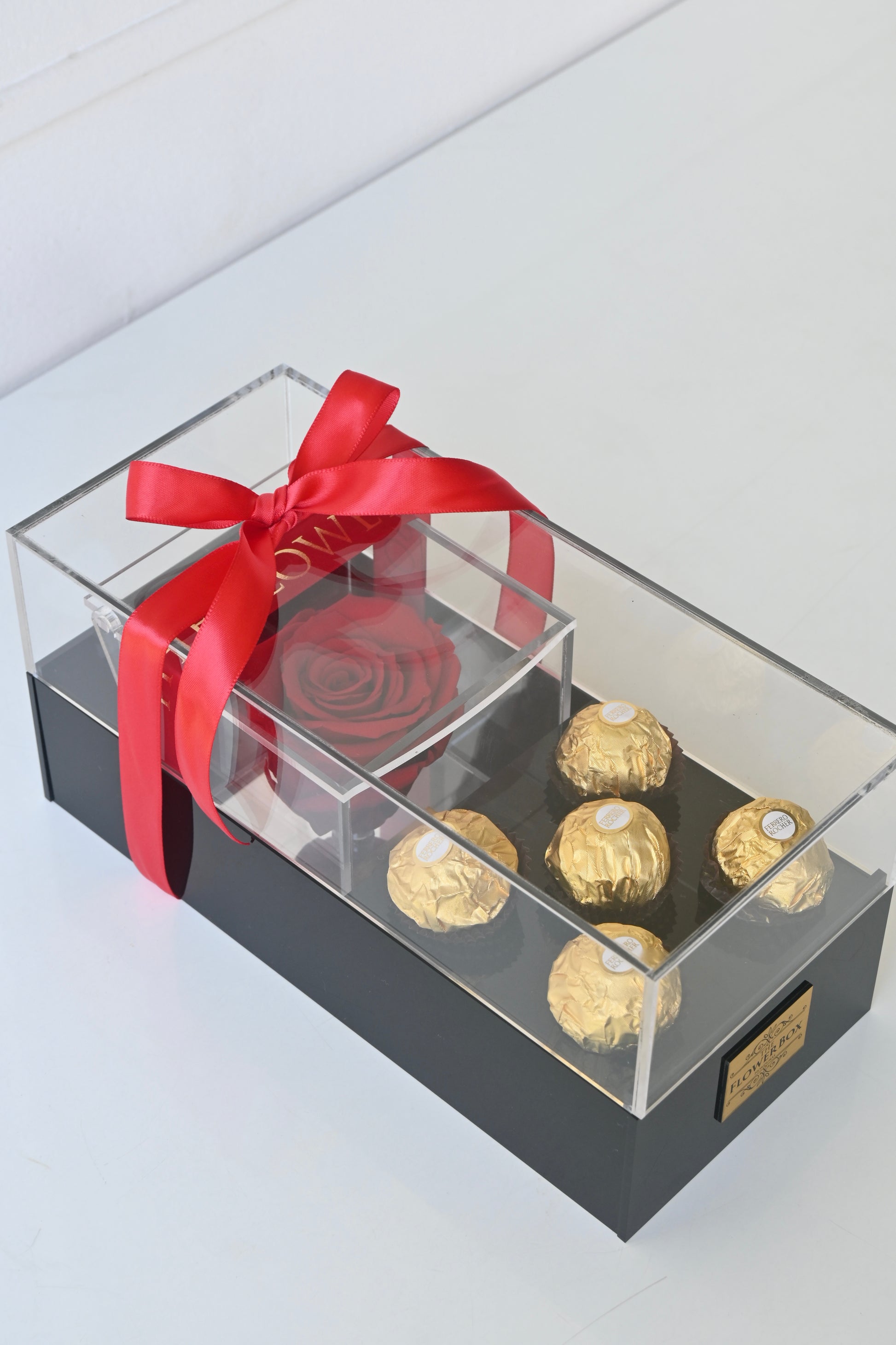 Box incluye: Rosa preservada de 1-3 años de duración y 5 chocolates Ferrero Rocher en caja acrílica.