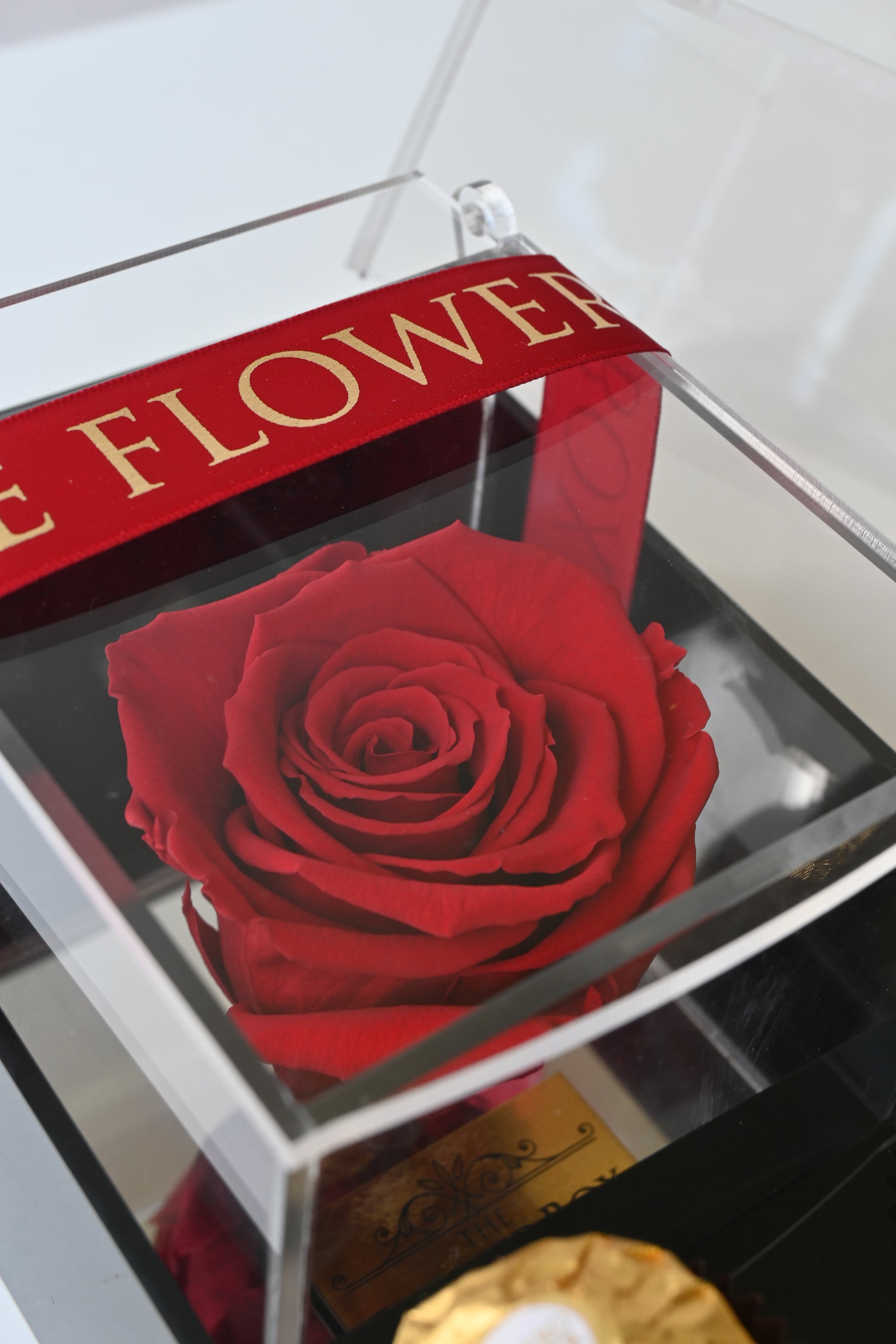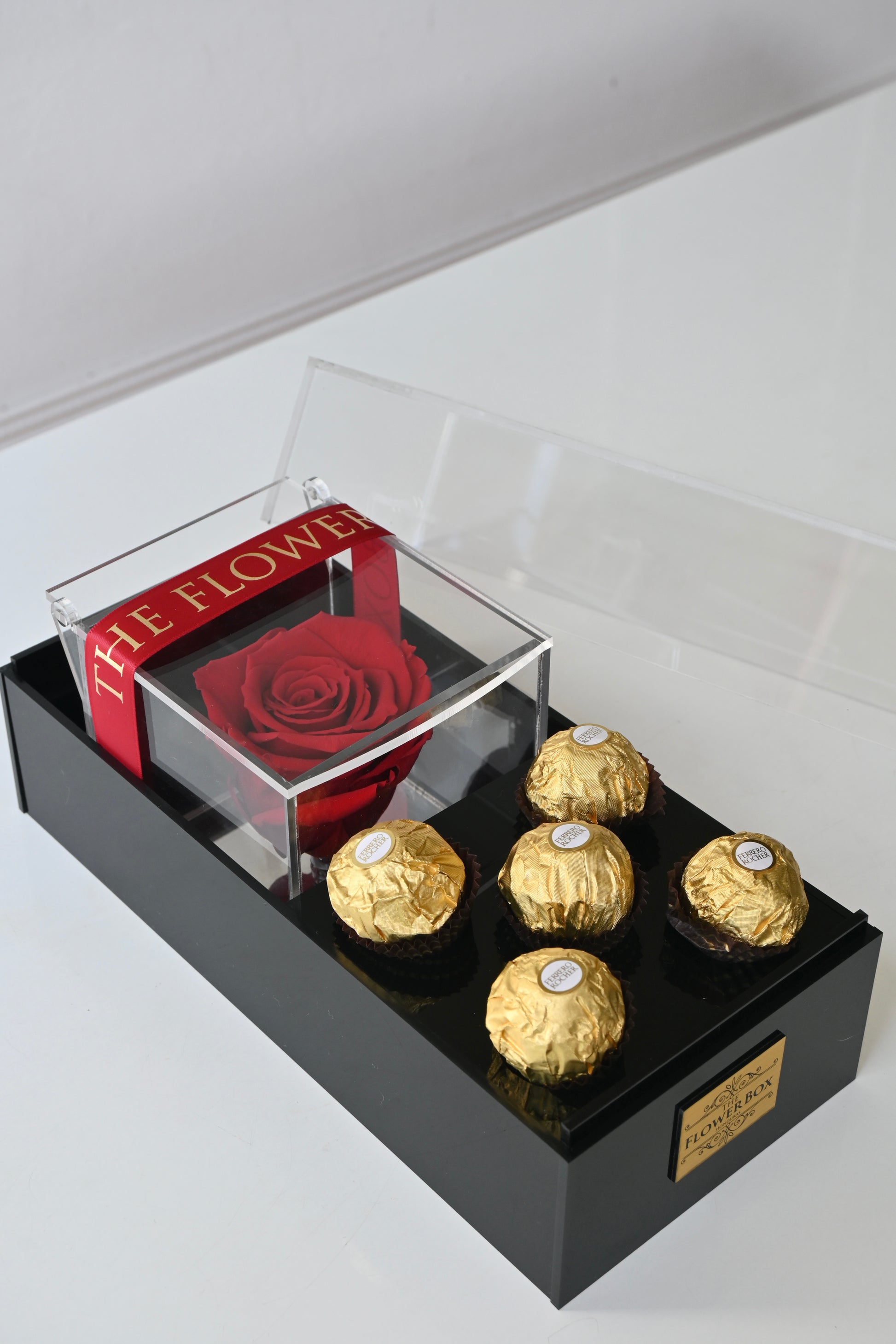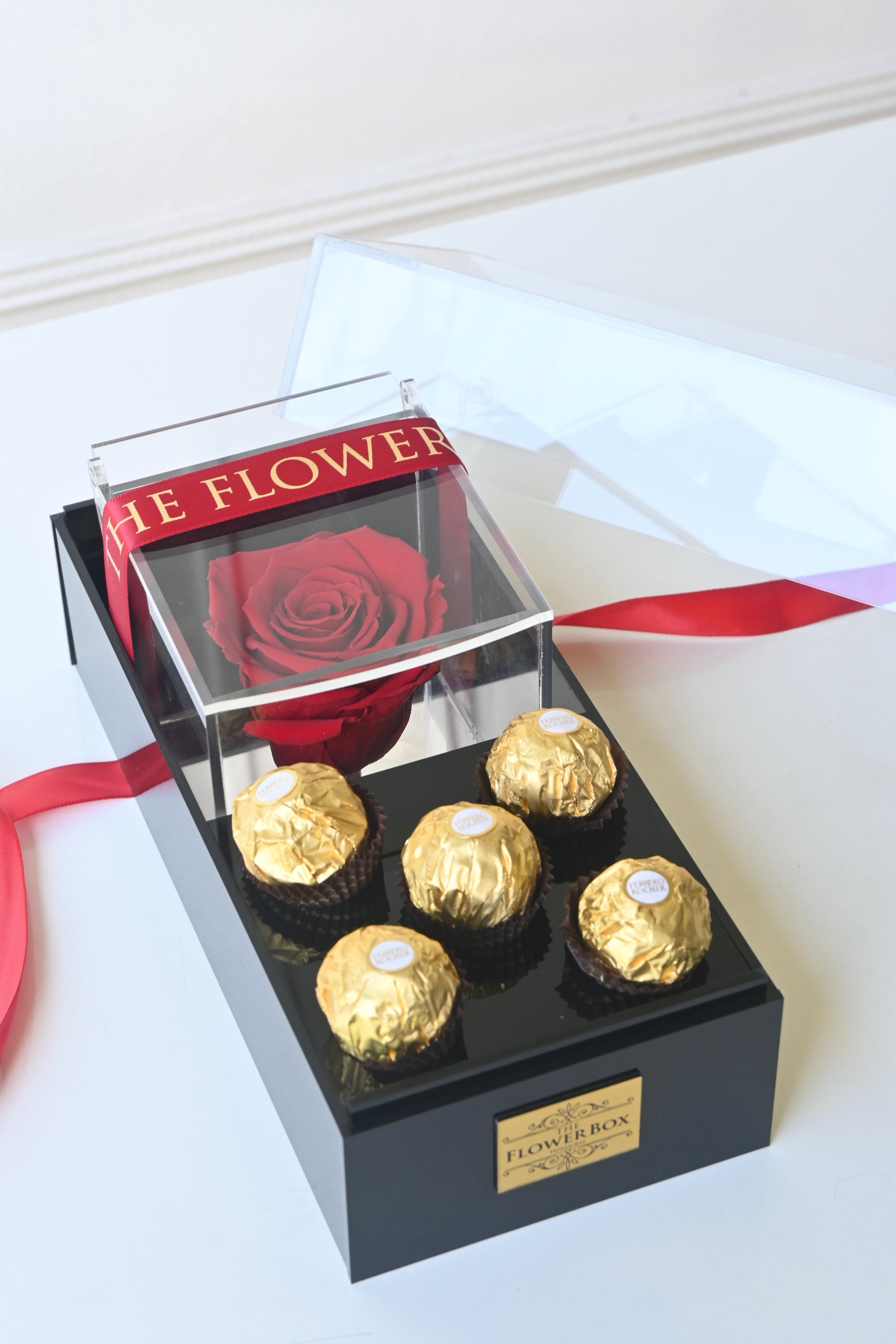 Box incluye: Rosa preservada de 1-3 años de duración y 5 chocolates Ferrero Rocher en caja acrílica.