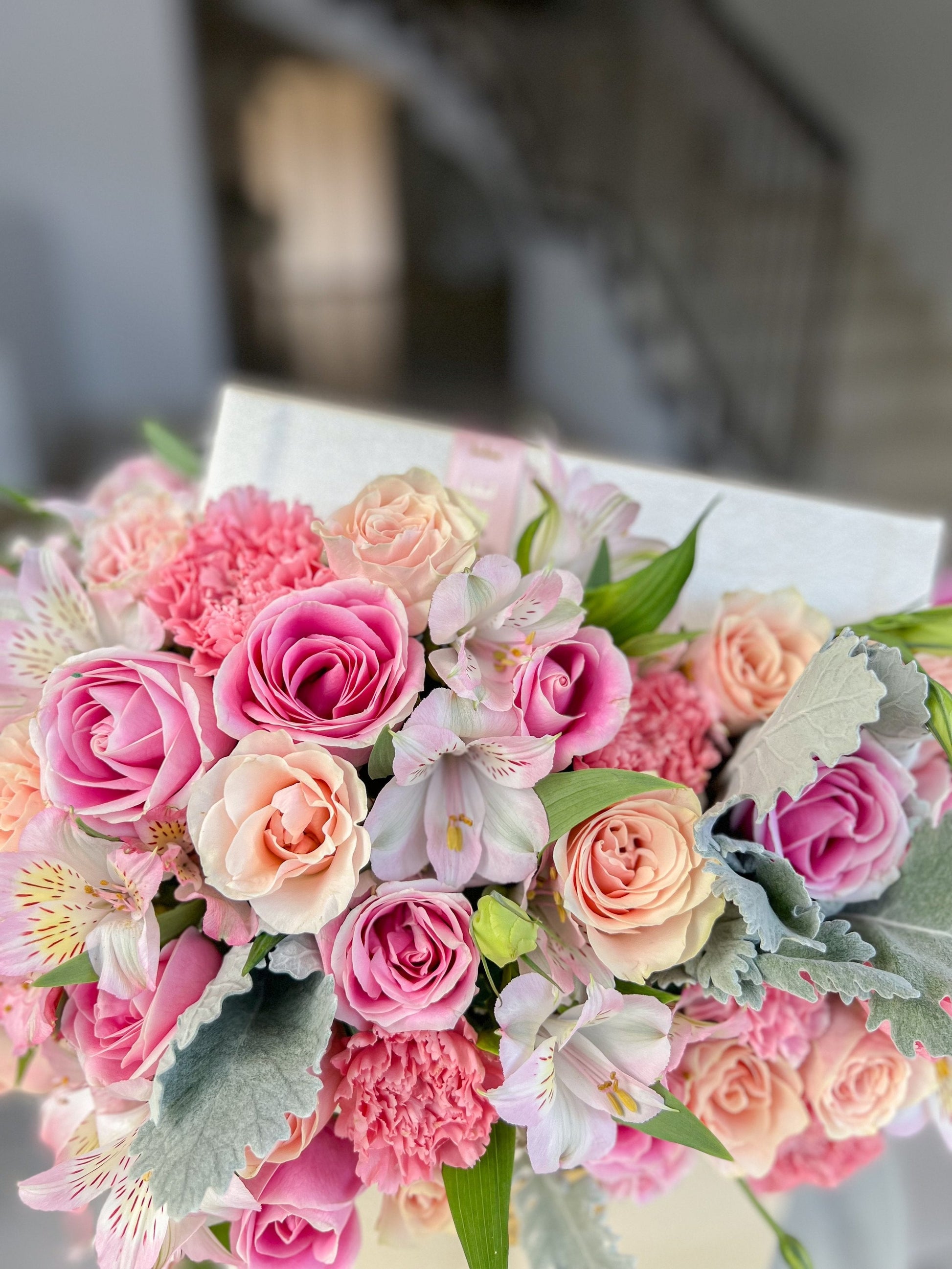 Flores utilizadas: Combinación de rosas, follaje, claveles