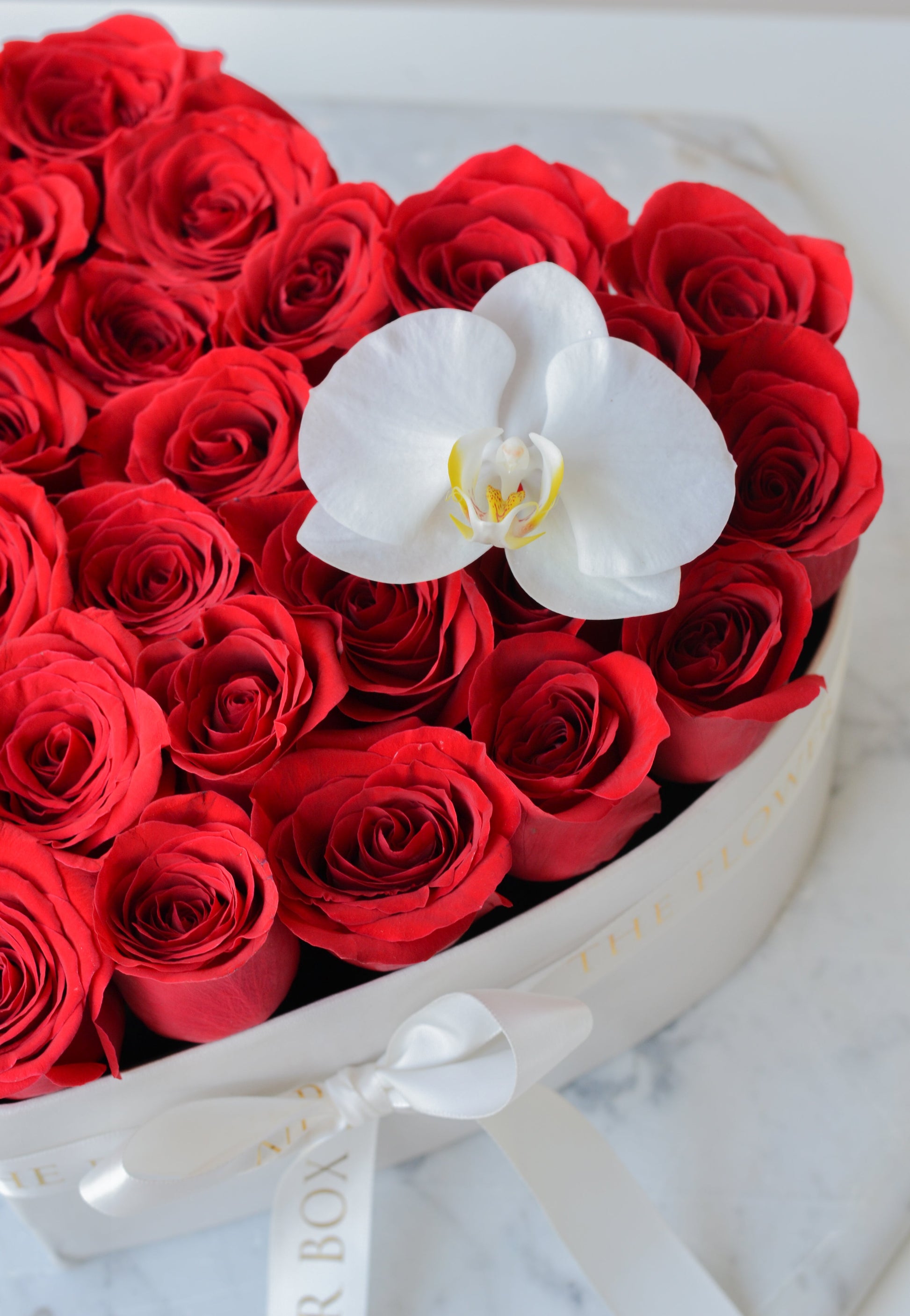 Nuestro arreglo está elaborado en una caja elegante color blanco, rosas y una hermosa orquídea blanca.