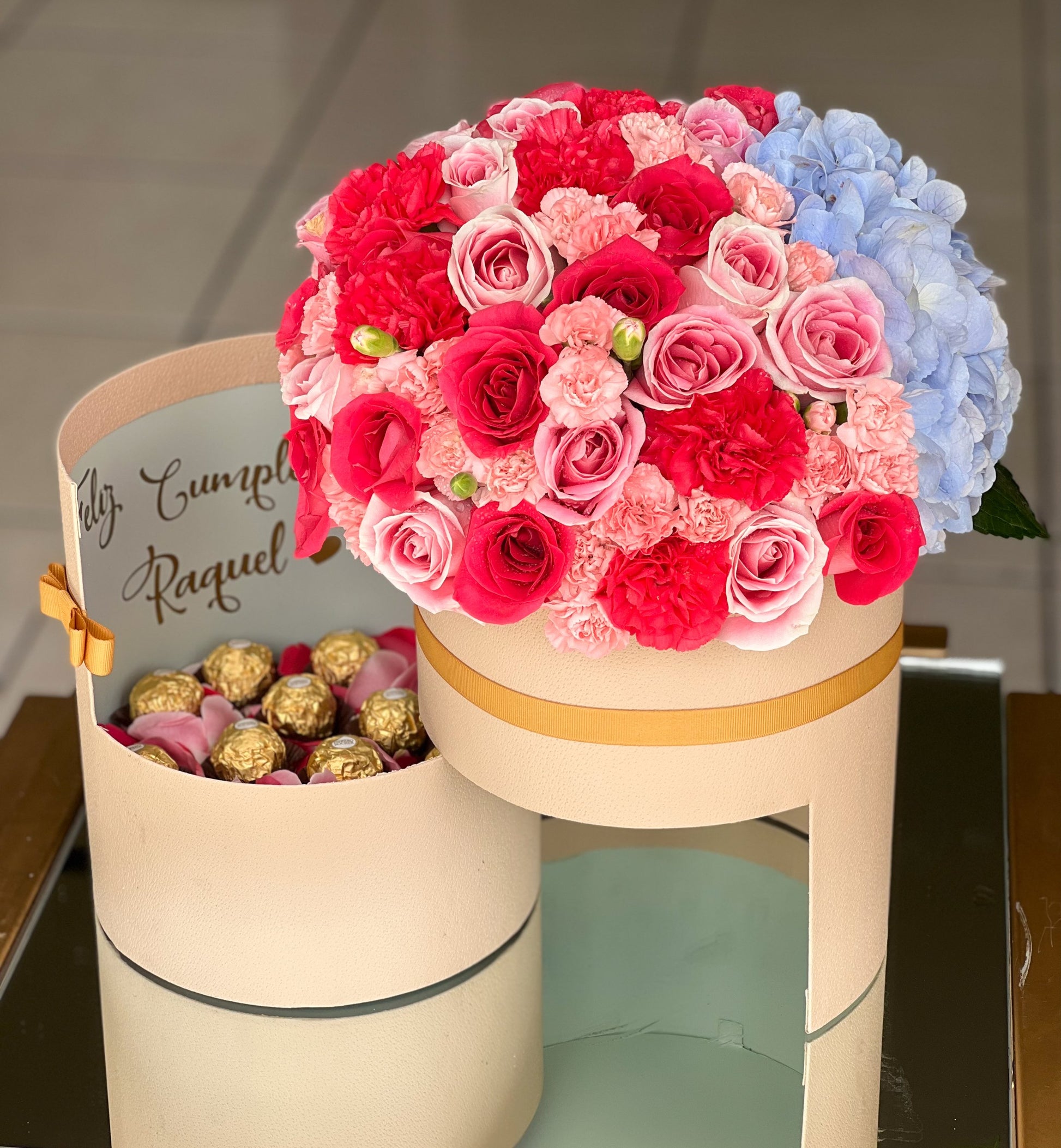 Nuestro arreglo “Eiffel Box” disponible en una sofisticada cuero peach con mensaje personalizado y chocolates ferrero rocher