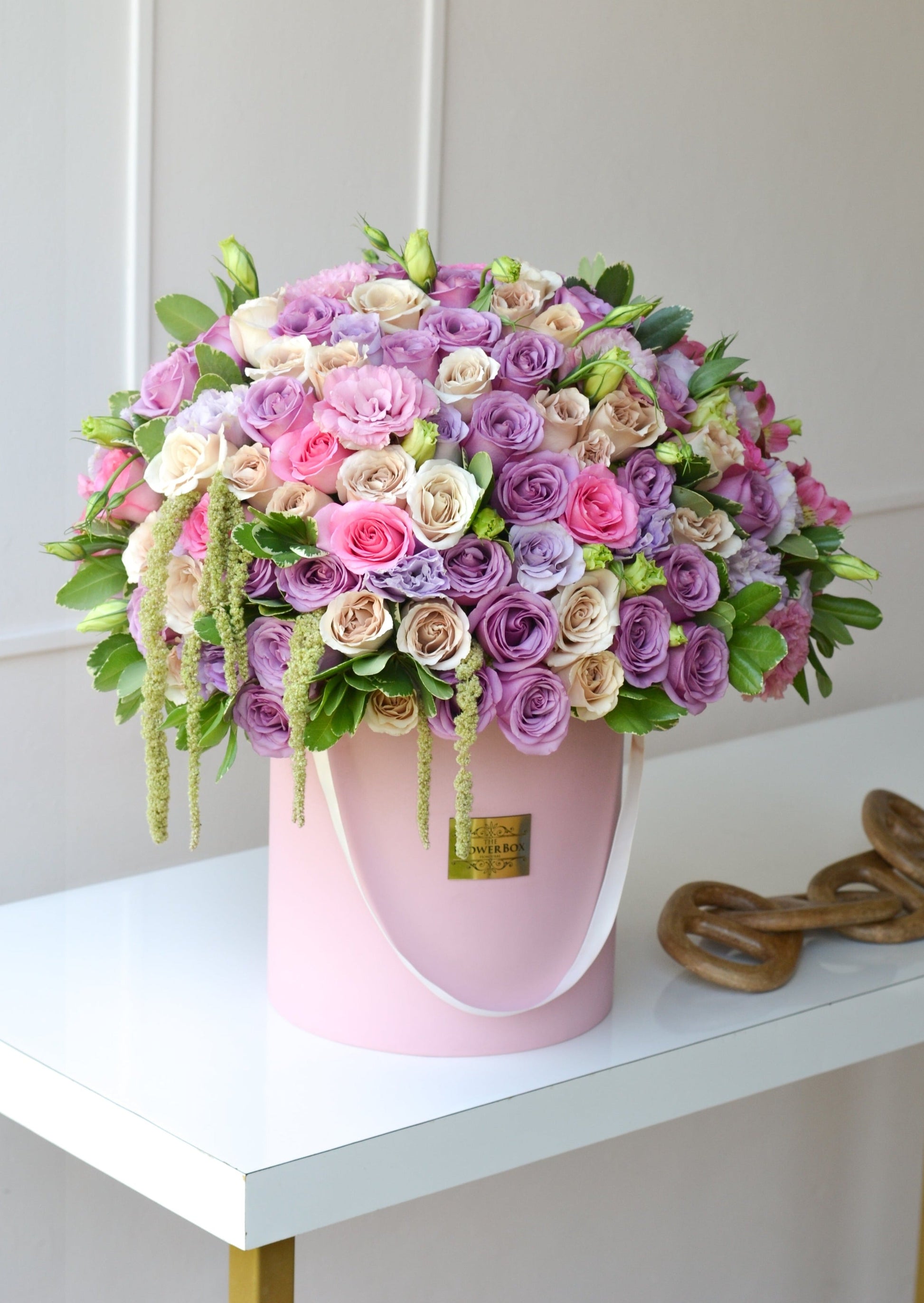 La caja de flores en tonos rosados es una pieza elegante y sofisticada que complementa perfectamente las flores. Además, las rosas son frescas y de la mejor calidad, asegurando que el arreglo luzca espectacular durante varios días.