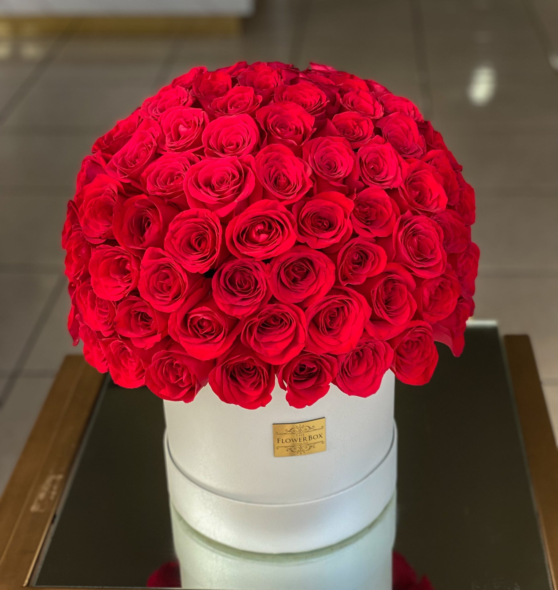 Nuestra clásica caja de cuerina blanco con rosas rojas en esfera.