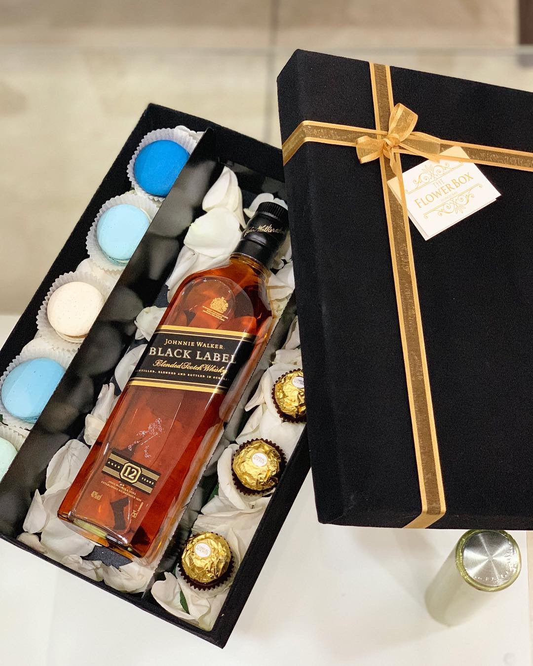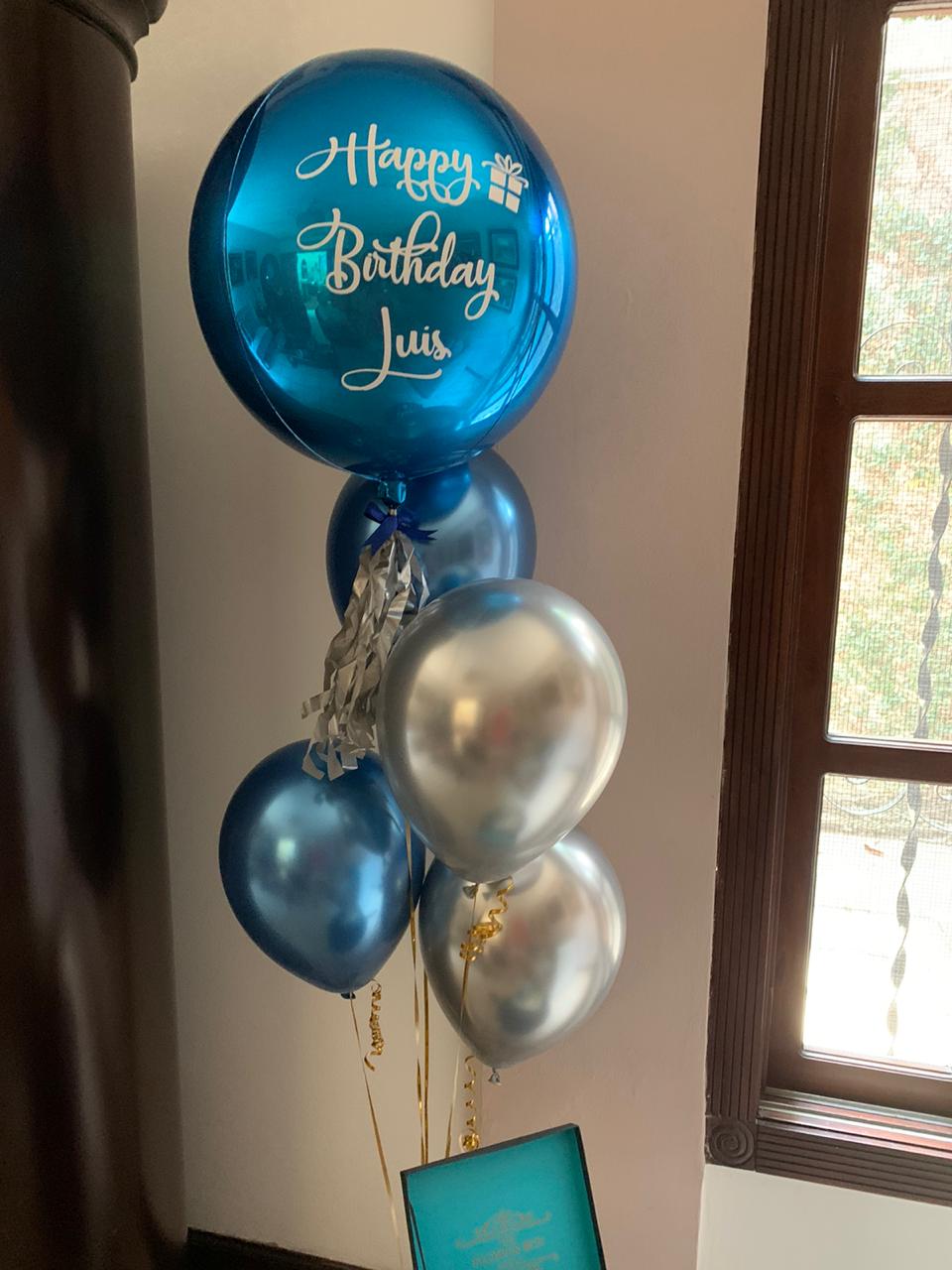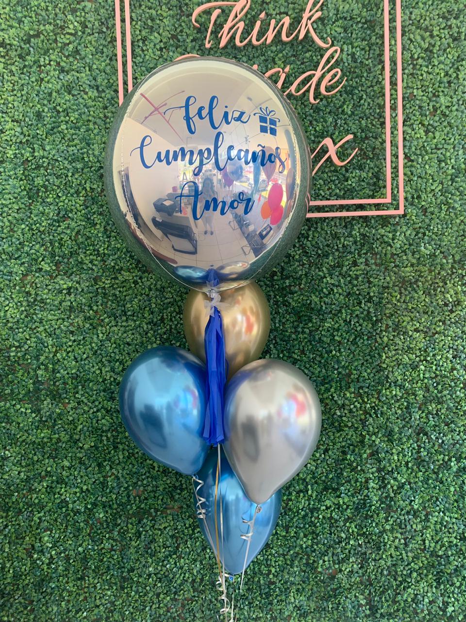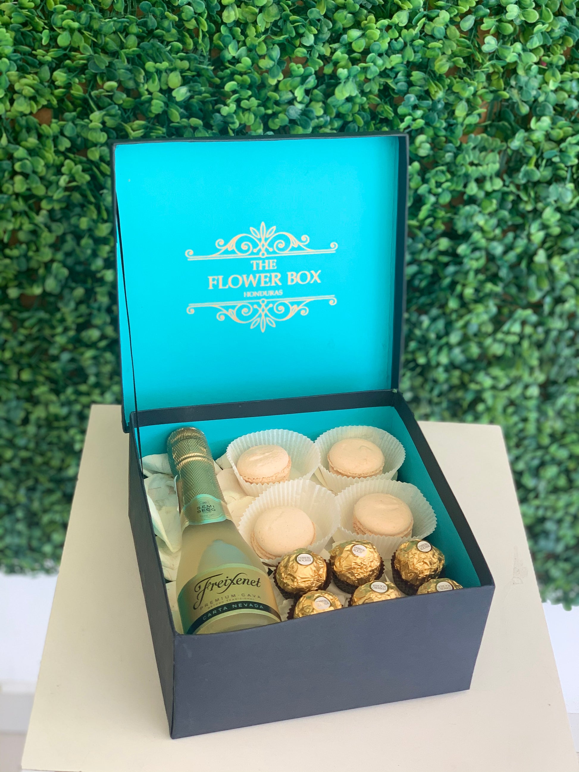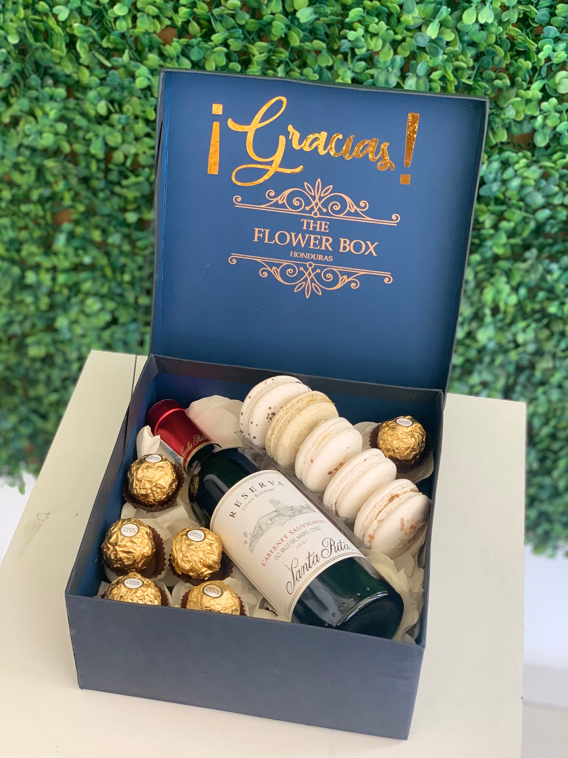 *Cada caja es elaborada exactamente como aparece en la foto. Incluye botella y dulces. No se pueden personalizar con excepción del mensaje en los globos.