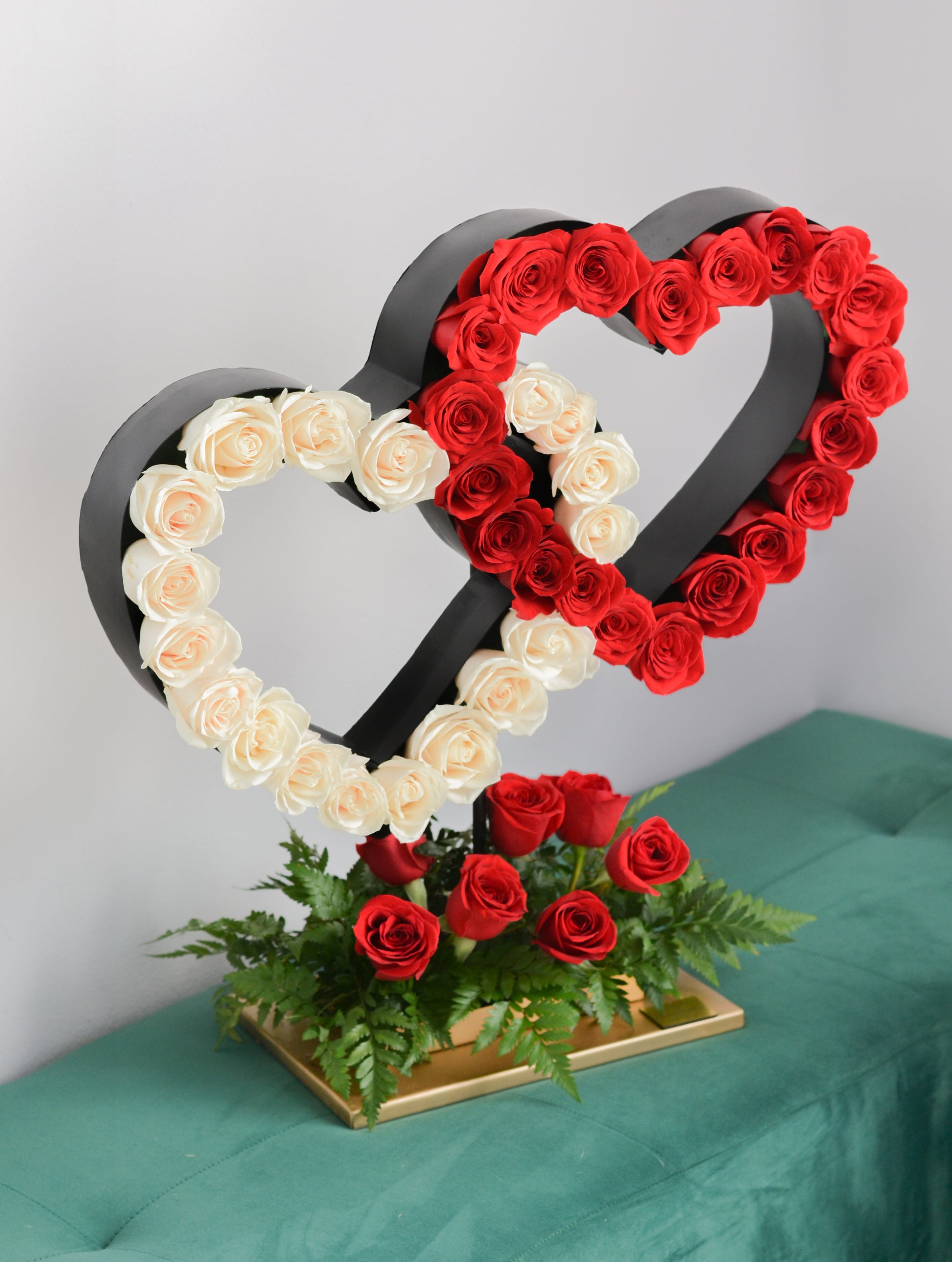 Nuestro arreglo “Fusion Heart” está compuesto con una base de rosas y dos corazones combinados con rosas blancas/rojas o rosado claro/ fuchsia.