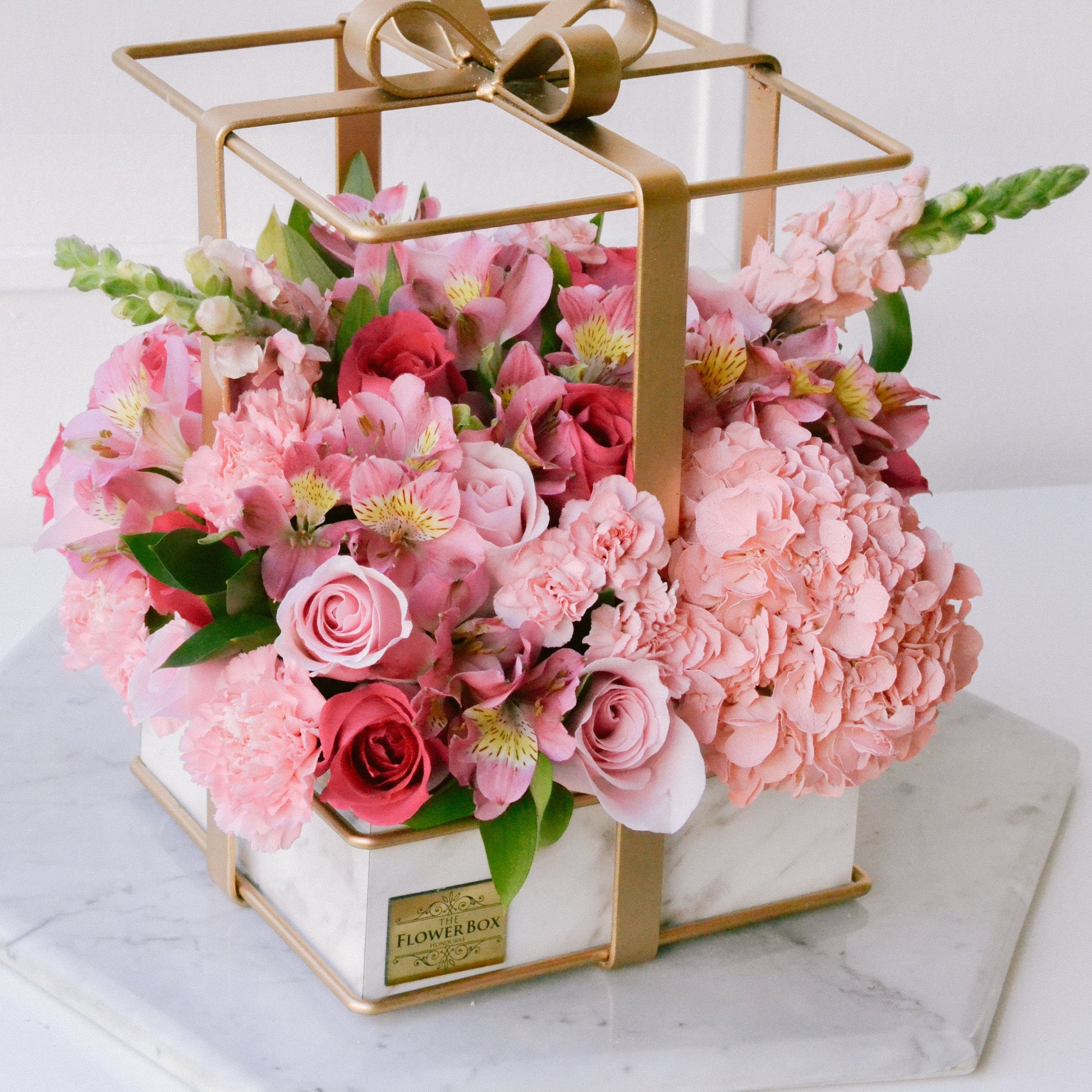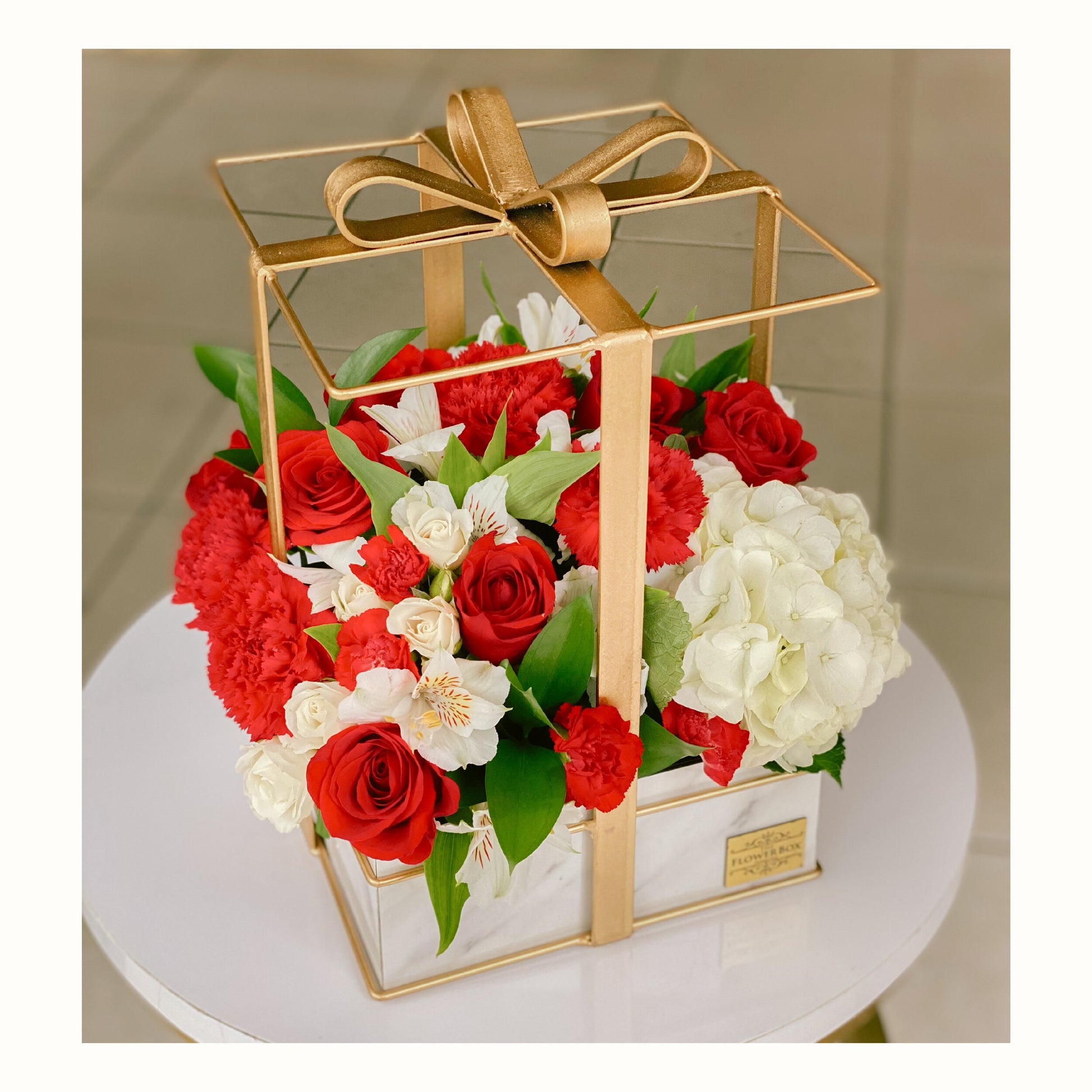 Disponible en una elegante caja con base de mármol blanco y un marco dorado en forma de regalo. Puedes escoger nuestros tonos rojos o rosados.