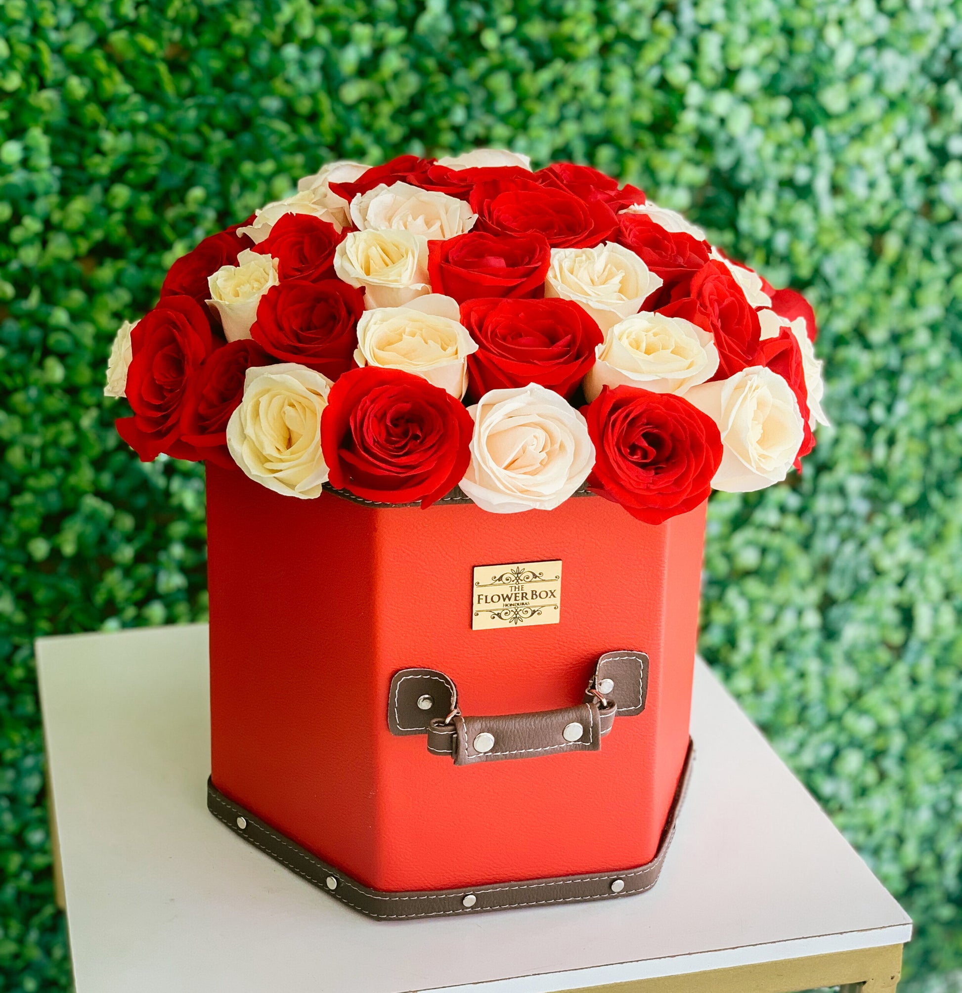 Nuestro arreglo viene diseñado en una caja de cuero con rosas blancas y rojas.