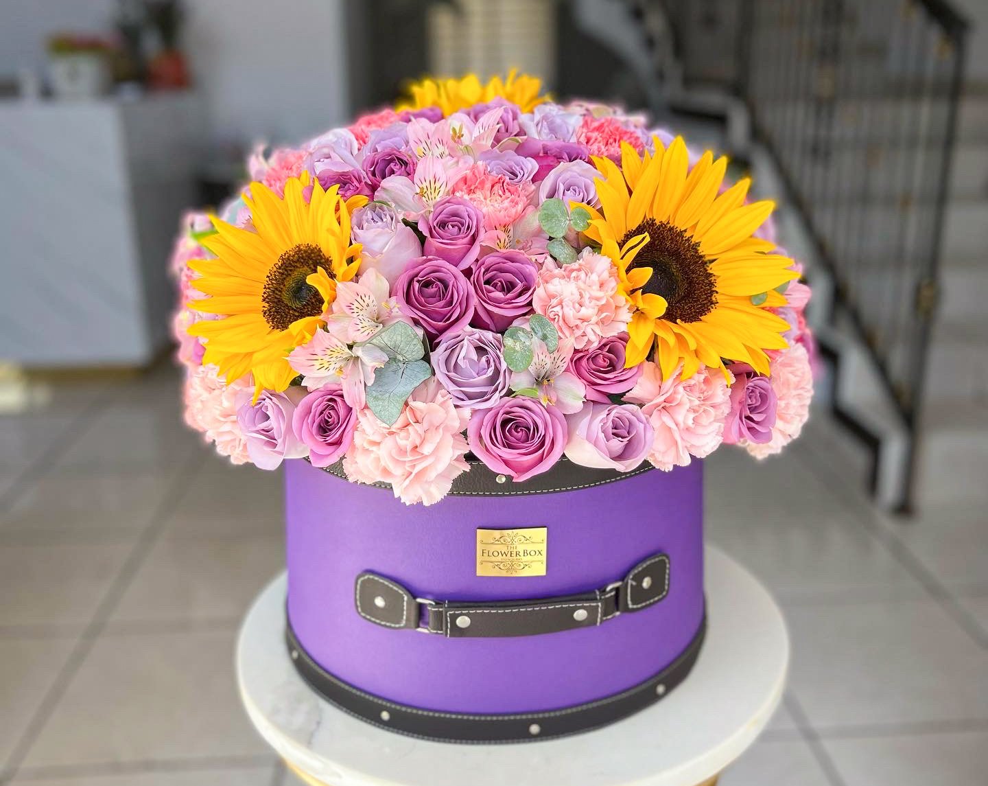 Nuestro arreglo viene diseñado en una caja de cuero con morado, girasoles, claveles